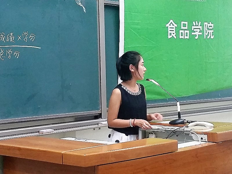 王逸冉同学用自己平实、诙谐的语言劝导2016级同学要多读书,多思考,用自身思维感受世界,感知食品,成为真正的食品人。黄涵柔同学主要是介绍了一些生物工程专业的学习方法,开拓了大家的眼界,也让大家对于学习有比较深刻的感悟。马硕同学向大家讲述自己大学三年的学习生活经验。她与台下的新生们亲切互动,向他们讲解了学分绩点的计算方法及考研的相关信息,告诉大家,在老员工活中一味的学习是不够的,要懂得灵活的学习,全面发展很重要。