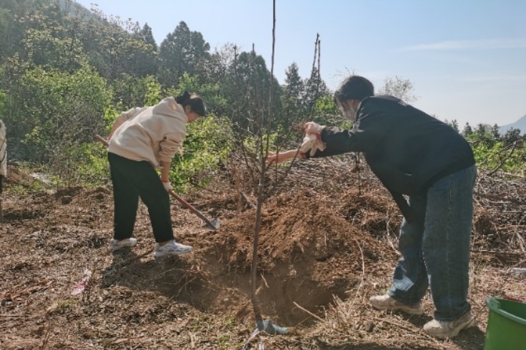习近平总书记在4月4日在参加首都义务植树活动时曾提出“森林既是水库、钱库、粮库,也是碳库。植树造林是一件很有意义的事情,是一项功在当代、利在千秋的崇高事业,要一以贯之、持续做下去”。植树现场,同志们有序分组,分工明确,干劲十足,配合默契,挥锹铲土、栽植新绿、培土围堰。现场一派繁忙有序、热火朝天的劳动景象,洋溢着团结协作、昂扬向上的融洽氛围。大家用双手播种新绿,用行动收获低碳,一棵棵树苗在谷山村“安家落户”,尽显春日盎然生机。党员同志用实际行动践行总书记“绿水青山就是金山银山”的理念,树牢爱绿、植绿、护绿意识。