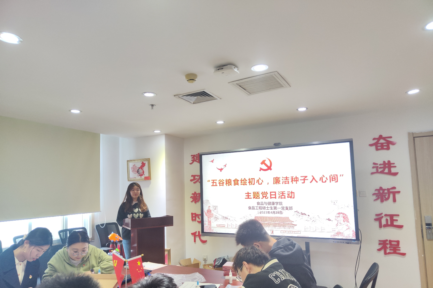 党的二十大报告提出要“加强新时代廉洁文化建设”这一重大课题,在二十届中央纪委二次全会上习近平总书记再次强调,“要在不想腐上巩固提升,更加注重正本清源、固本培元,加强新时代廉洁文化建设”。为深入学习贯彻总书记这一重要精神指示,进一步加强廉政文化建设,食品工程硕士生第一党支部于4月28日开展“五谷粮食绘初心,廉洁种子入心间”主题党日活动。公司副经理李健老师、支部党员、积极分子参加此次党日活动,活动由支部书记李欣萍主持。