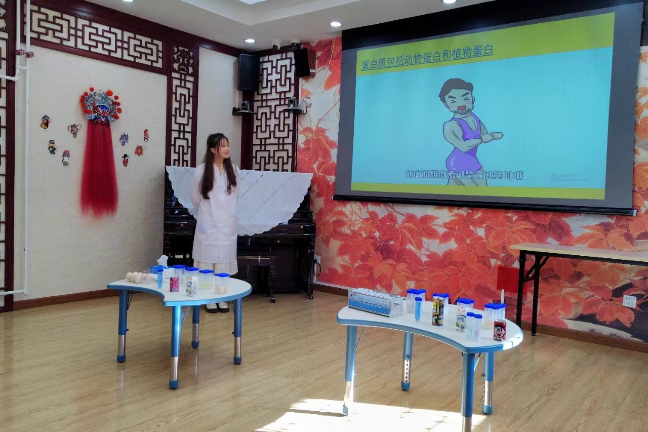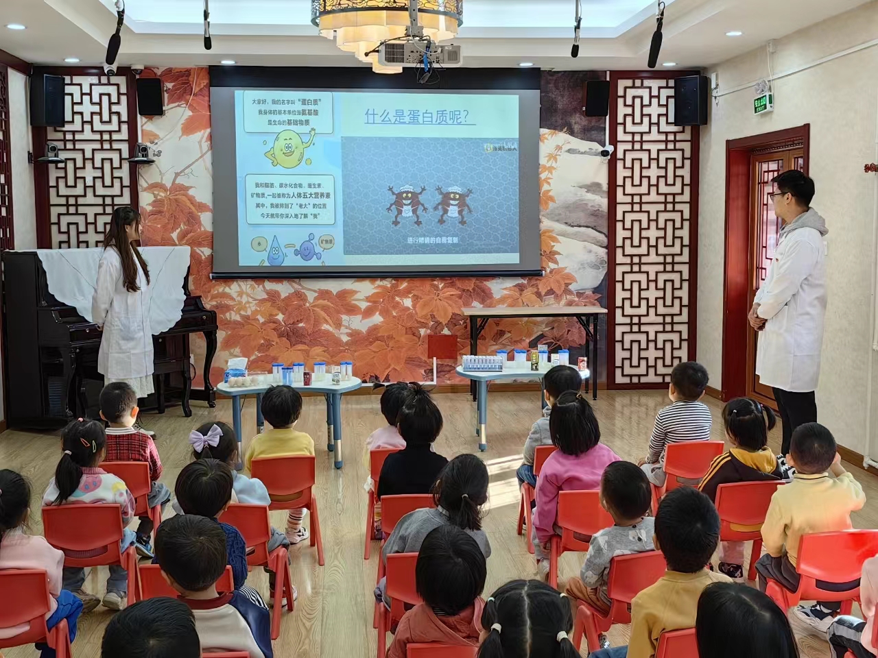 活动现场,硕士生党员温雁超、姜伟业围绕“蛋白质对健康的重要性”主题,通过视频讲解、图文结合、互动问答、动手实验等多种形式,向小朋友深入浅出的讲解什么是蛋白质、哪些食物里含有蛋白质、如何检测蛋白质等科学常识。引导幼儿从生活出发,向小朋友们生动地介绍了身边的食品安全小知识以及生活卫生常识,并根据“蛋白质特性”带领小朋友们做了趣味实验,检测不同食物中是否含有蛋白质。