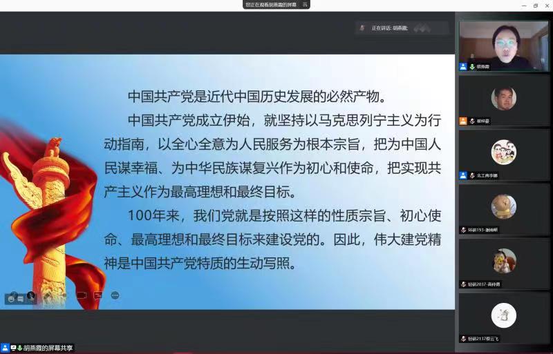 胡书记结合习近平总书记“七一”重要讲话精神,围绕“坚持真理、坚守理想,践行初心、担当使命,不怕牺牲、英勇斗争,对党忠诚、不负人民”的伟大建党精神,通过大量历史史实和一个个鲜活事例诠释中国共产党的精神之源,回顾了共产党100年的风雨征程,详细阐述了中国共产党为什么能够得到人民的拥护和爱戴,阐述党的初心和使命就是党的性质宗旨、理想信念、奋斗目标的集中体现。胡书记希望大家要把学习贯彻习近平总书记“七一”重要讲话精神与学习“四史”结合起来,大力弘扬建党精神,做初心使命的坚实守护者,做对党忠诚的坚决执行者;要从历史中的“红船精神”,井冈山精神,现在的戍边精神,抗疫精神中凝炼精华、汲取力量,勇于探索,善于学习。
