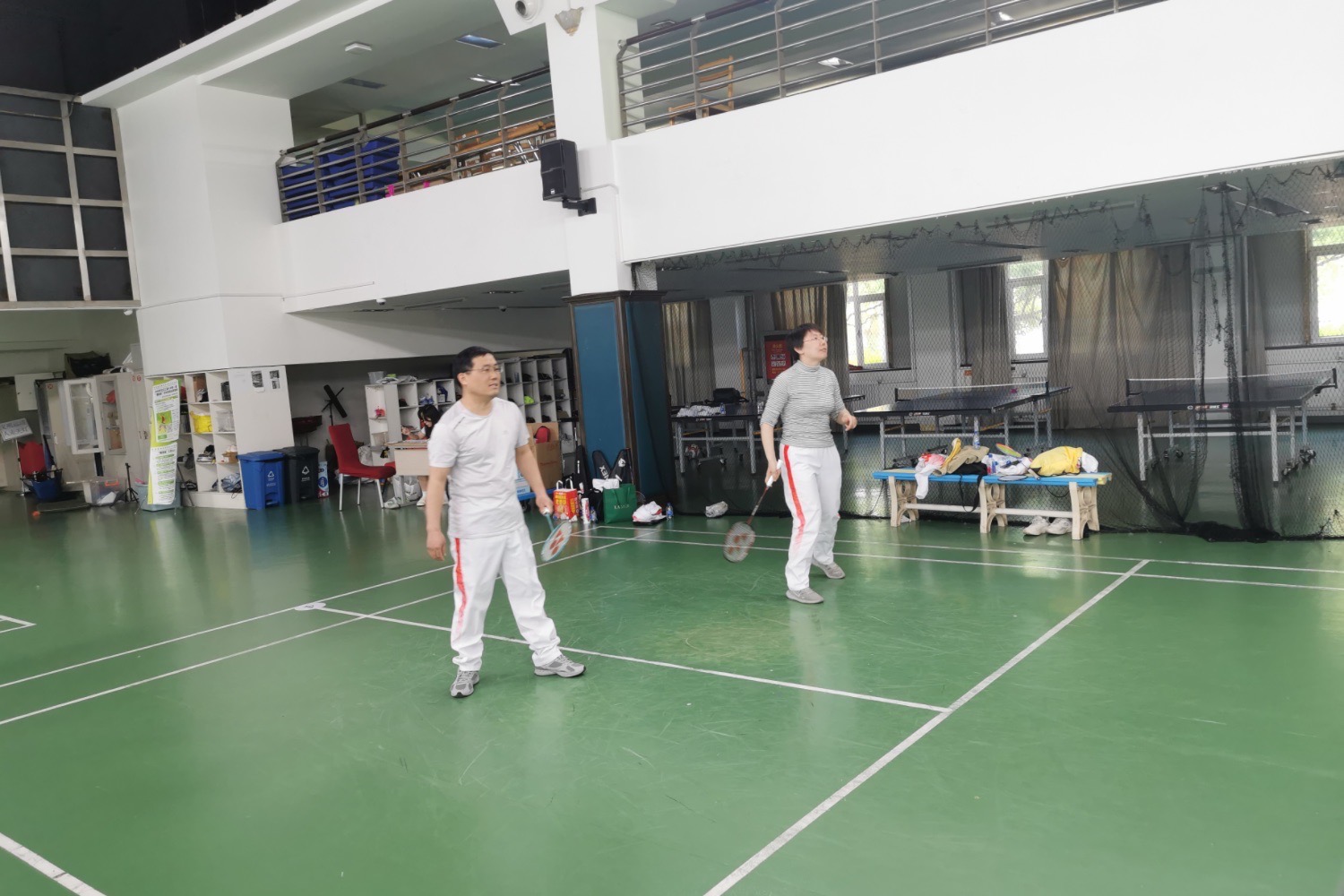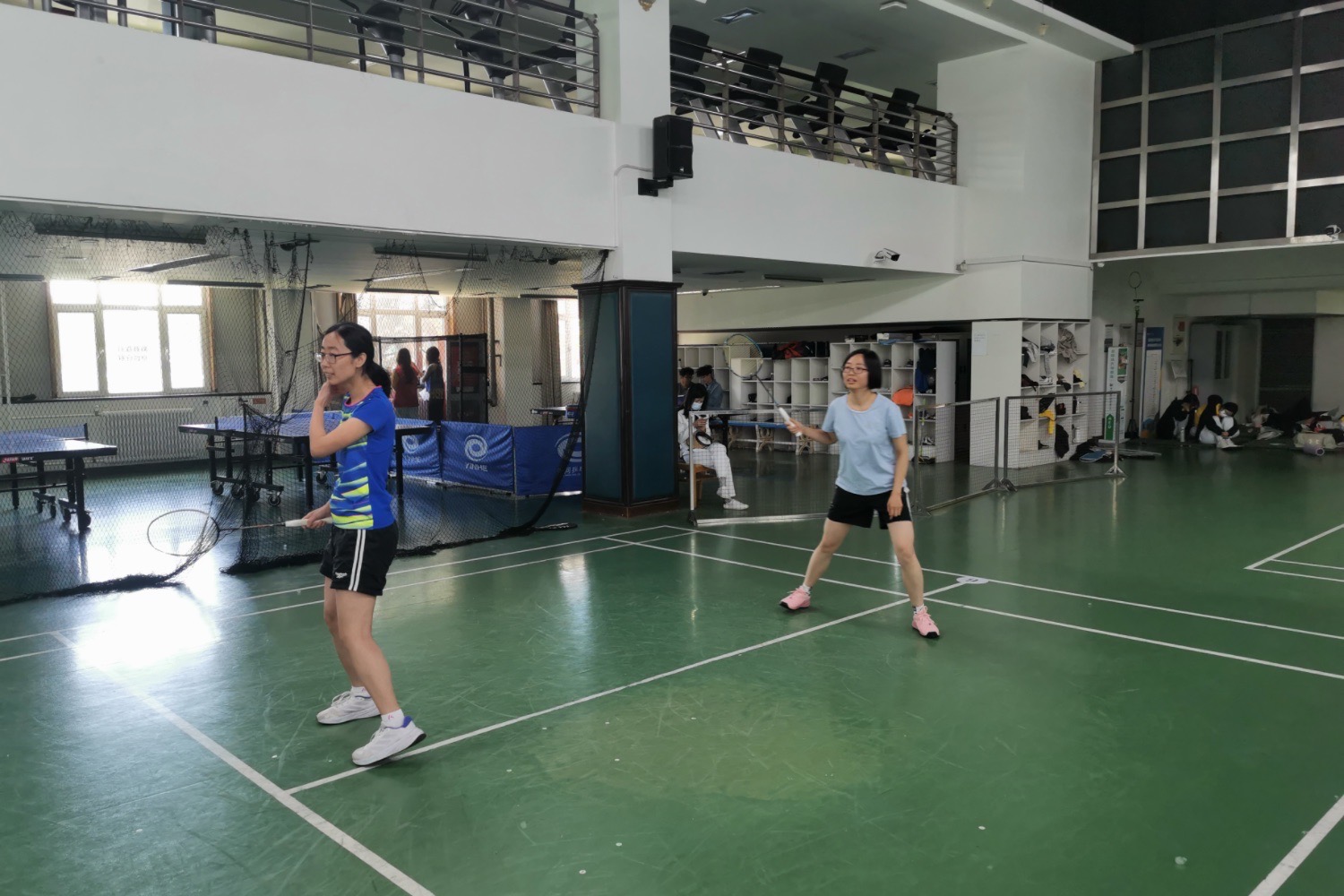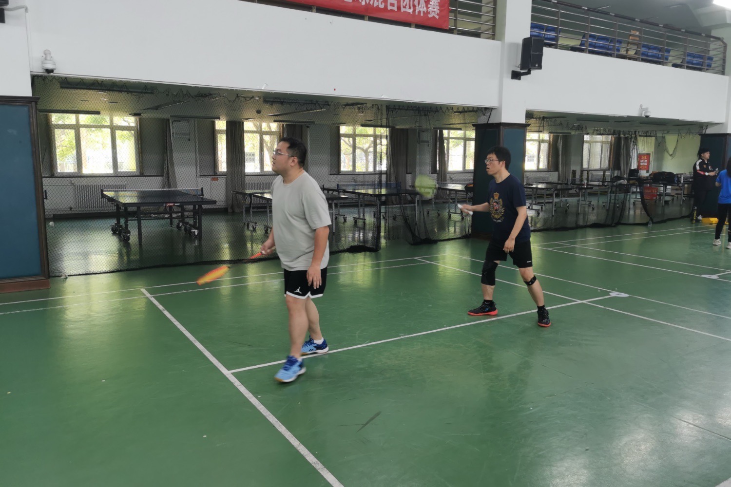 广播体操表演结束之后,校羽协组织的羽毛球比赛紧锣密鼓地开展。在分工会委员李金旺老师的带领下,公司12位教师选手先后登场,分别对战计算机与人工智能公司、经济公司和机关教工。面对强劲的对手,参赛教师们斗志昂扬、默契配合、顽强拼搏,生动诠释了体育精神的内涵。场边的老师热情地为参赛选手加油助威。