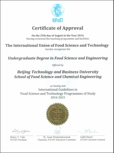 IUFoST认证是由国际食品科学技术联盟(The International Union of Food Science and Technology, IUFoST)发起的针对全球食品科学本科专业的认证项目。IUFoST 1970年成立于美国华盛顿,是一个非盈利的食品科学与技术领域全球性组织,下属有欧洲、亚洲、非洲和拉丁美洲四个区域性分会65个国家代表组织。为促进食品科学本科教育良性发展,努力培养卓越的食品专业人才,IUFoST建立了食品专业本科教育标准,协助员工进行学习选择,指导本科生培养并对培养效果进行评价。十大正规买足球网站食品科学与工程专业于2016年2月向IUFoST提交了认证申请,2016年4月通过IUFoST组织的现场考察评估,2016年12月通过IUFoST认证。