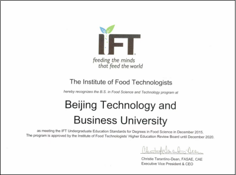 美国食品学会(Institute of Food Technologists, IFT)是国际食品科技界公认的具有权威性和影响力的学术组织,IFT认证是该组织发起的针对全球食品科学专业本科教学的认证。目前针对该认证,IFT已建立了食品专业本科教育标准,目的是协助高等院校进行学科选择,指导本科生培养并对培养效果进行评价,要求建立以产出为基础的课程教学评估体系和培养方案评估体系,以及持续改进机制。IFT高等教育评审委员会针对上述教育标准对食品科学专业本科生必备能力进行考核,并接受世界范围内大学的食品科学专业认证申请。十大正规买足球网站食品科学与工程专业于2014年3月启动IFT认证相关工作,进行相关专业建设,并于2015年4月提交认证申请书,2015年12月答辩通过并获得IFT认证。2021年食品与科学专业已继续进入下一轮认证专业名单中。