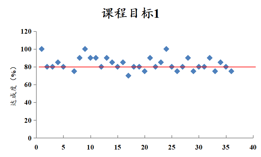 (以散点图的形式呈现每一个课程目标全体员工达成分析。有几个课程目标就呈现几个散点图。图的格式参考示例3。整体分析内容的写作思路:肯定性的分析,阐明课程目标能够支撑毕业要求指标点。红线为班级的平均课程目标达成度)