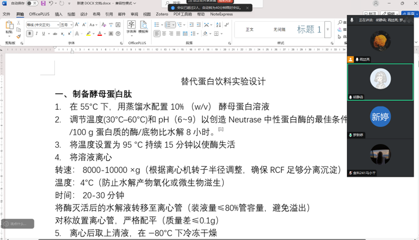 寒假期间,该项目小组成员完成了酵母蛋白肽与大豆蛋白肽的定向酶解工艺优化实验设计,确定了最佳复配比例,并完成了产品原型设计。团队还进行了市场调研和竞品分析,完成了商业计划书的技术和生产板块。接下来将进行实验室攻坚,完成小试和感官评测,并筹备赛事。
