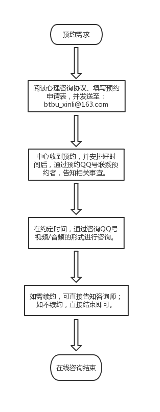 有需要的同学可将《网络心理咨询协议及预约申请表》发送至心理中心预约邮箱(btbu_xinli@163.com),心理中心会根据收到邮件的先后顺序及时安排,通过心理中心预约QQ号与预约同学联系并商定会谈时间及相关事宜。在约定的时间,中心咨询师会使用咨询QQ号添加同学的QQ号,并进行在线咨询。第一次咨询前需进行身份认证,具体方式为在视频时手持员工证,由中心咨询师截取视频画面,与来访同学的咨询档案保存在一起;如因网络原因等无法通过视频认证,则需来访同学向咨询QQ上传本人手持员工证的照片一张。