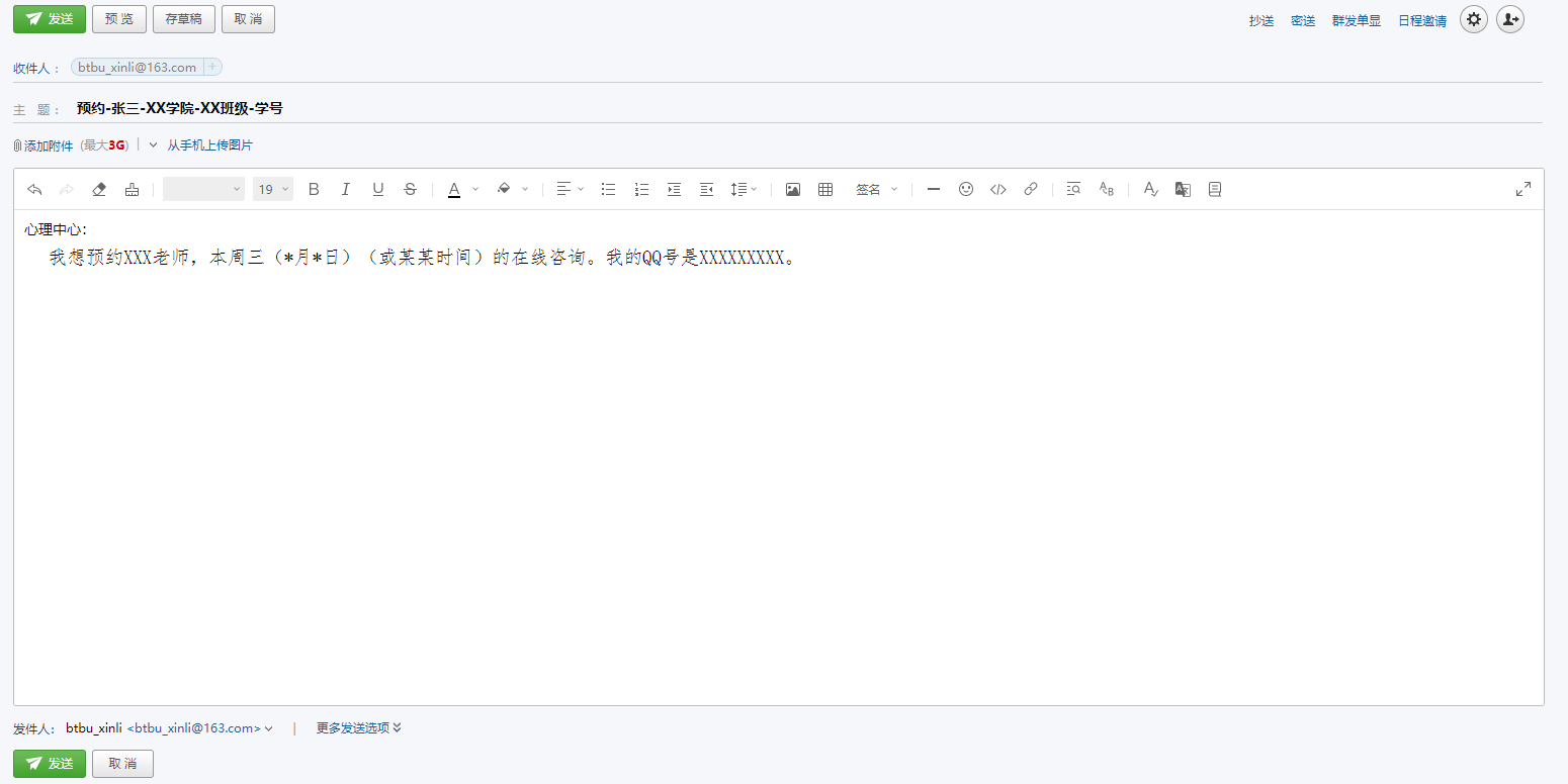 中心预约邮箱与工作QQ号,均由中心专职老师运维,运维过程严格遵循心理咨询的相关伦理。