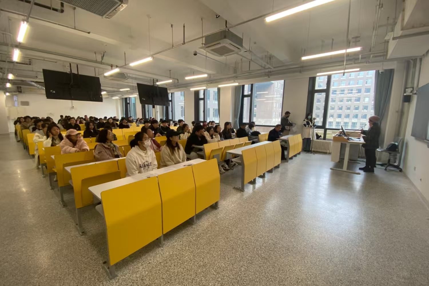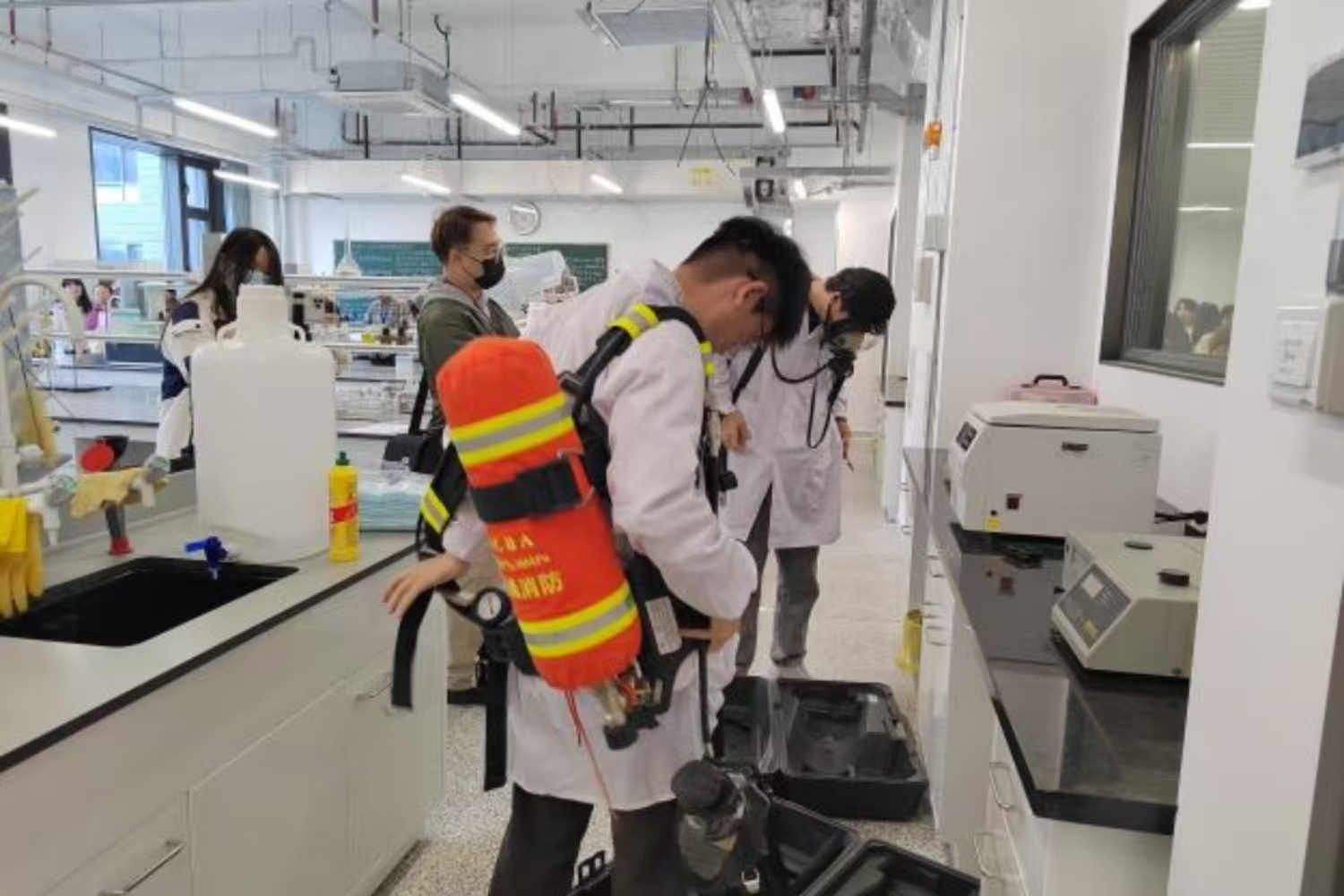 演练活动第一阶段是气瓶安全知识培训。培训由实验室管理处处长康智勇主持,特邀安全专家进行授课。专家从气瓶的安全管理与使用规范、日常维护要点以及典型事故案例等多个方面,为在场师生进行了一场深入浅出、内容翔实的专题讲座,有效夯实了大家的理论基础与风险防范意识。在紧张的实战演练环节,全体参演人员移步至预设演练场地B221实验室。演练模拟了该实验室发生“氮气泄漏”,导致一名“实验人员”缺氧昏迷的紧急场景。随着险情被发现,应急程序立即启动。实验室安全负责人迅速下达指令,现场师生反应迅速、分工明确,有人立即佩戴自给正压式呼吸器关闭气源、开窗通风;有人迅速拨打急救电话并将“伤员”转移至空气清新处;疏散负责老师则立即组织现场其他人员,用毛巾捂住口鼻,沿安全通道快速、有序撤离至紧急集合点。整个过程中,信息报送、现场警戒、人员清点等环节衔接紧密,完整再现了从事故发现、先期处置到全面响应、后期处置的全流程,全面检验了《实验室气瓶气体泄露事故现场处置方案》的科学性和可操作性。
