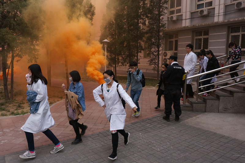 下午两点整,化工楼外燃起烟雾,火警警报迅速响起,师生们快速、有序地化工实验楼撤离,撤离过程快而不乱,401位师生仅用时5分钟就完成了从化工实验楼疏散、楼前广场集合和人数清点全部过程,顺利完成了疏散演习任务。