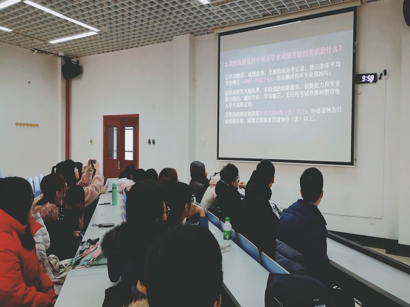 在班会的开始,各班分别组织了多姿多彩的素质拓展活动,将班内同学分为3组进行闯关答题游戏,同学们在游戏过程中,共同探讨了考研、出国、就业三种选择下,应该掌握的资源信息及应该如何准备的问题。