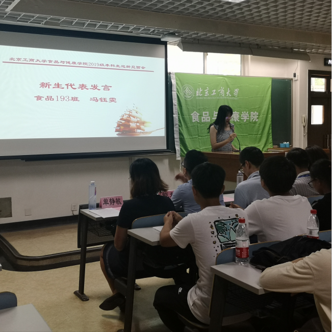 食品182班李子阳代表老生发言。他建议学弟学妹们大学应以学习为重,增强学习的自主性与自律性;积极参加集体活动,树立责任担当意识;养成良好的生活习惯与品德。要与公司同向,与时代同行,遇见最好的自己,拥抱青春的一切美好。