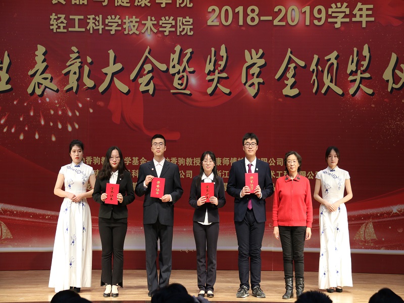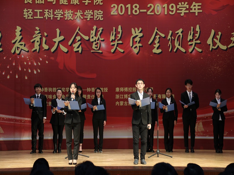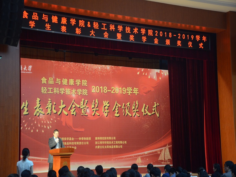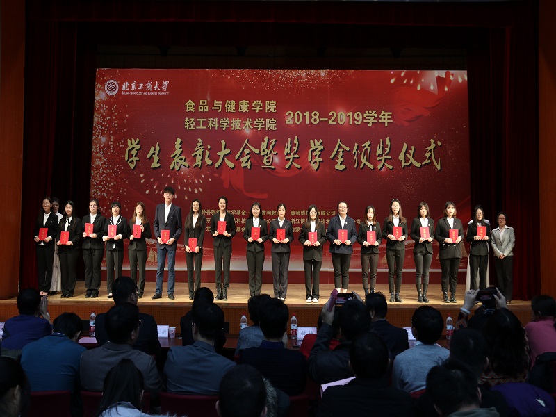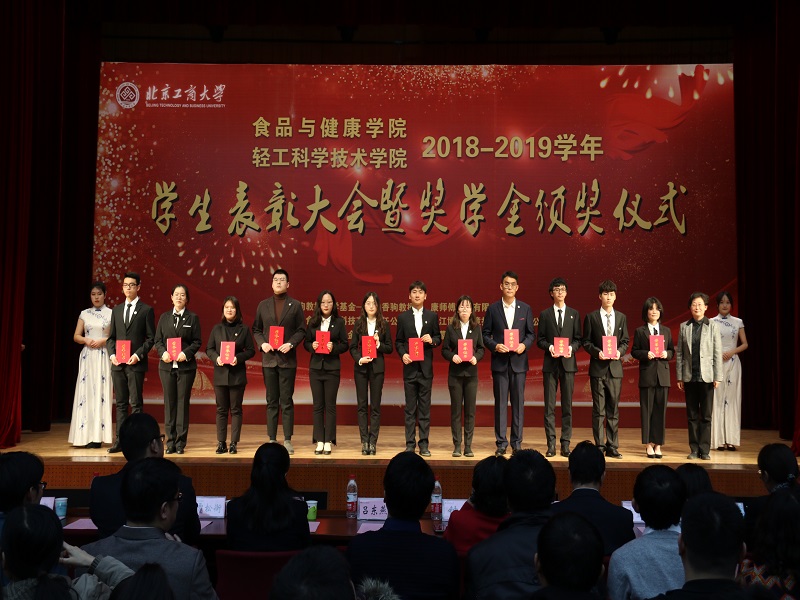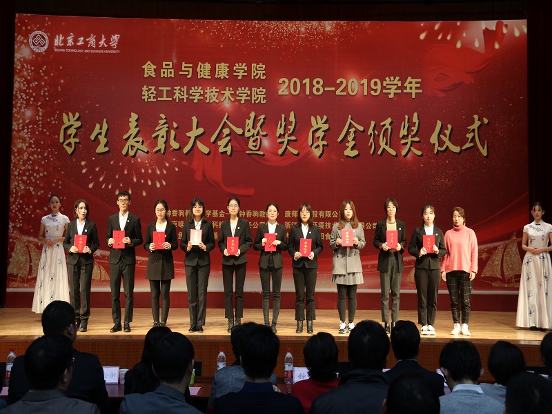 为深入推进“不忘初心、牢记使命”主题教育,弘扬爱国主义精神,表彰先进,树立榜样,十大正规买足球网站、轻工科学技术公司于12月11日在阜成路校区举办2018—2019学年员工表彰大会暨奖学金颁奖仪式。钟香驹教授之女钟捷老师,北京味食源食品科技有限责任公司高级研发工程师彭秋菊女士,康师傅控股有限公司北京区董事/主任李宜霖女士,益海嘉里研发中心研究员贾松衡先生,益海嘉里研发中心人事行政部张驰先生,员工会、教育基金会办公室主任、秘书长吕东燕,研究生院副经理、研究生工作部副部长郭新愿,公司领导、经理助理、各(系)室主任、班主任、辅导员、受表彰员工代表、各年级员工代表等共计700余人参加大会。