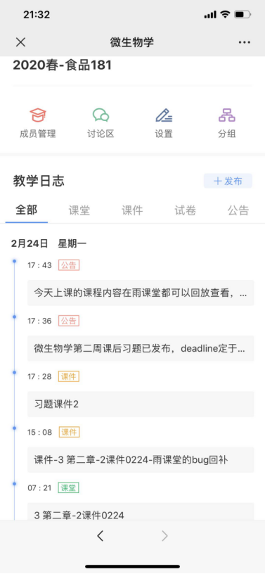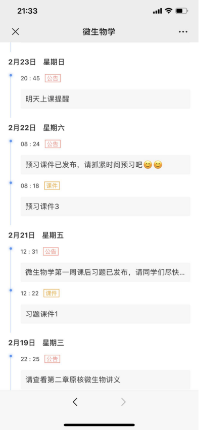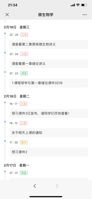 自2月14日《微生物学》课堂测试至2月24日雨课堂教学日志如下图所示(日期为倒序)。