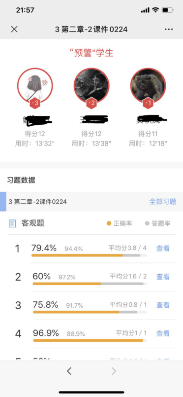 3. 员工的对接与沟通方面困难更多,从一对一(班)的课堂模式变成了课上一对一(员工)课下一对N(所有员工+班主任+员工家长)的形式,建好微信群课前课后发通知发公告总有不响应的同学,单独微信也不回,只能联系班主任联系家长反复强调,看员工遇到了什么样的困难商量如何解决;及时关注员工预习及课堂互动动态,雨课堂平台测试分析功能这一点十分好,课堂测试收题即有答题情况分析,可随时了解员工理解和掌握的状况,没有理解的难点部分可当时进行讲解,个人认为这对员工帮助比较大。