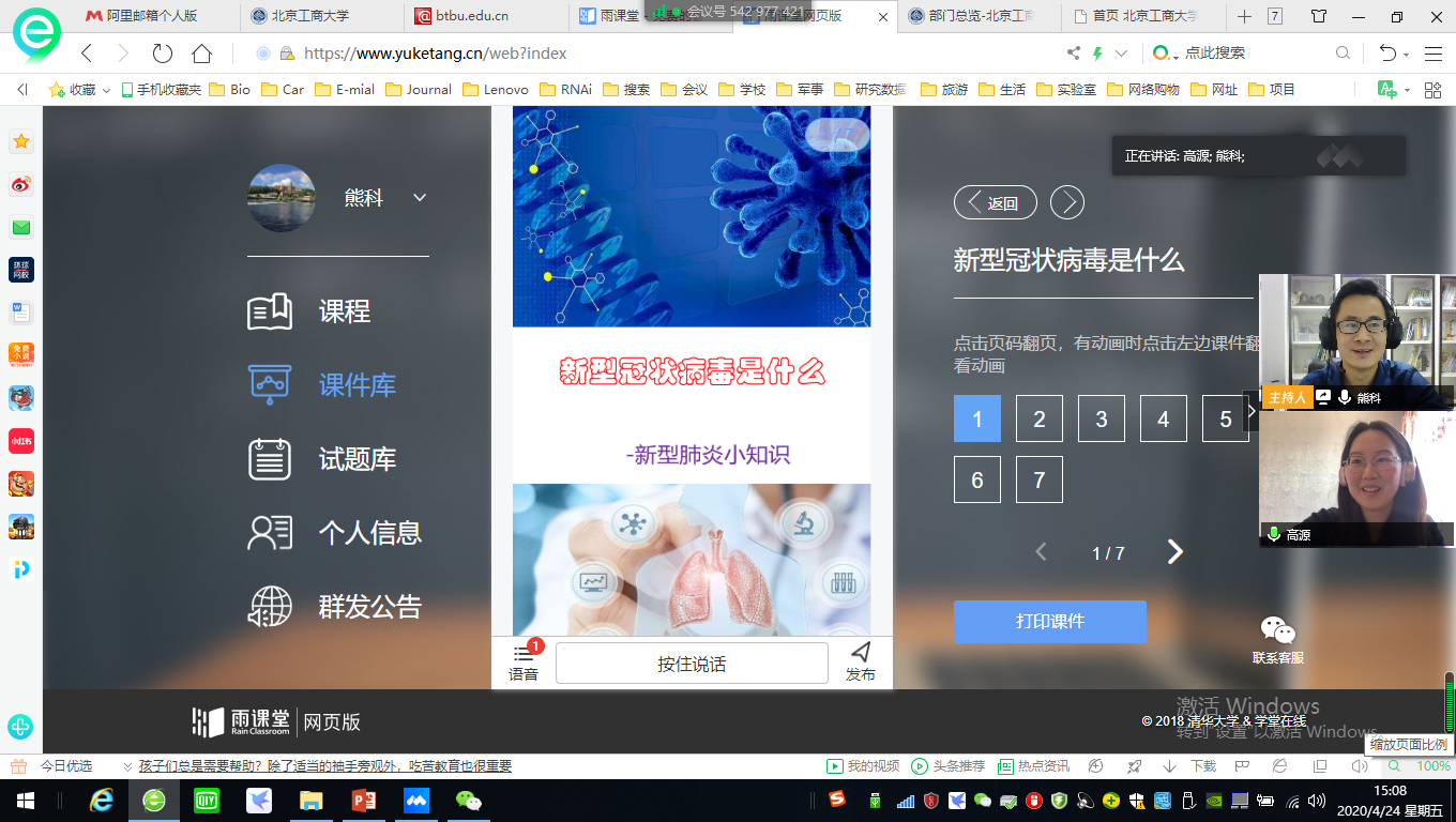 微生物双语课程的线上教学不知不觉,已经快接近尾声,我从最初的茫然、忐忑不安到现在的从容不迫、得心应手期间感悟颇深。一开始收到线上教学的通知时,多多少少有些不适应。面对着电脑屏幕,没有熟悉的黑板和粉笔,仅靠课件和解说,怎样上好一节课,让员工们都能听懂,心里不由得担心。通过对腾讯课堂,腾讯会议,雨课堂等软件的学习,最终决定通过腾讯课堂直播的形式进行授课,讨论,签到等任务的布置,通过雨课堂进行,课堂练习,测试,作业,并以腾讯会议和微信群辅助教学。这样通过网络授课,开始了我的直播生活。