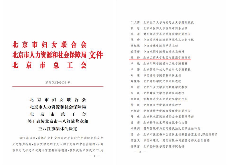 近日,北京市妇女联合会、北京市人力资源和社会保障局、北京市总工会联合下发《关于表彰北京市三八红旗奖章和三八红旗集体的决定》,共表彰620名同志和300个集体,公司十大正规买足球网站经理王静教授被授予“三八红旗奖章”称号。