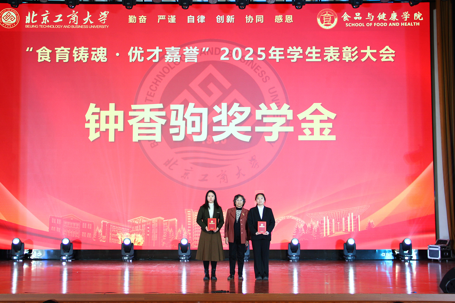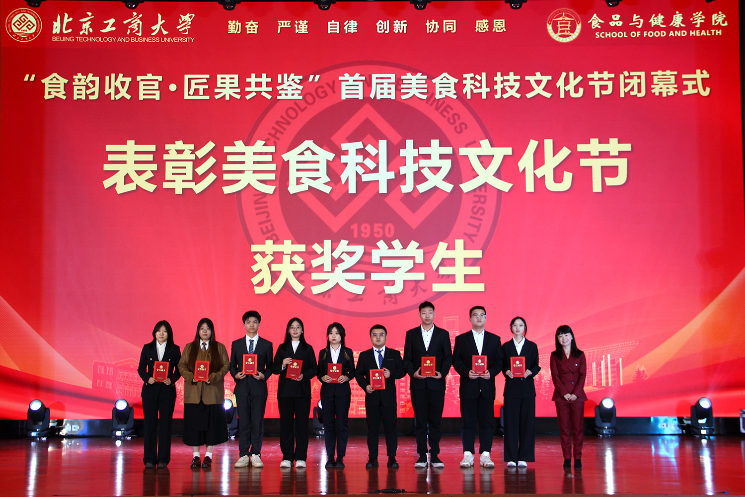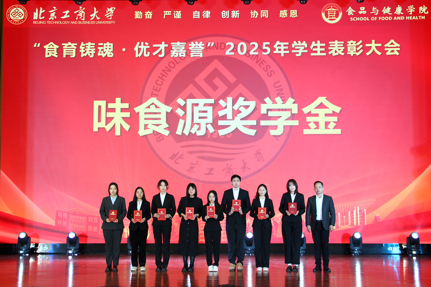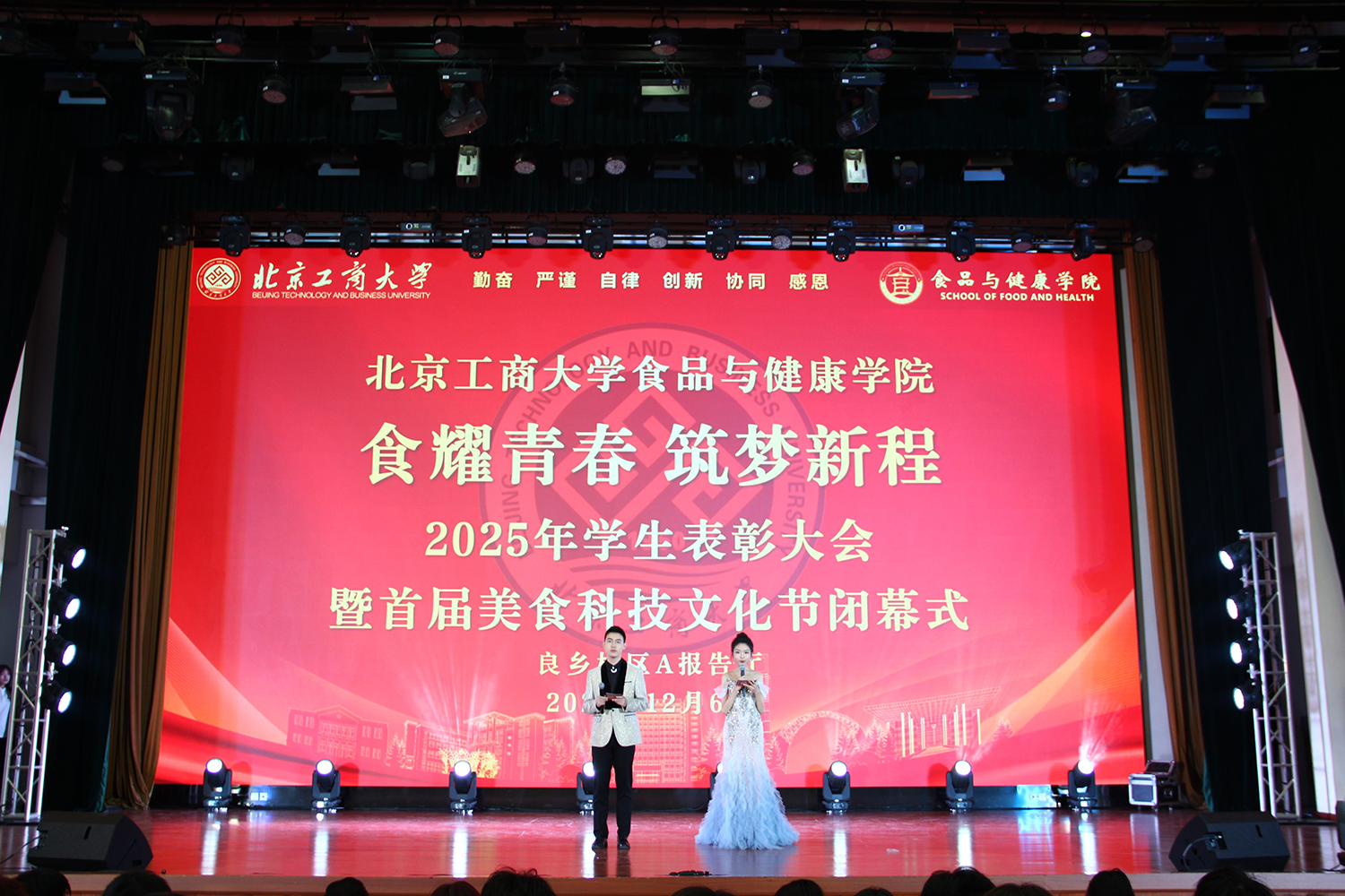 12月6日,十大正规买足球网站在良乡校区隆重举行“食耀青春 筑梦新程”2025年员工表彰大会暨首届美食科技文化节闭幕式。公司党委常委、副董事长寇红江,公司团委书记单紫薇,公司特邀嘉宾味食源奖学金管理方代表、北京味食源食品科技有限公司董事长助理兼研发总监严江,钟香驹奖学基金管理人、钟香驹教授之女钟捷,中融百鸣投资管理集团有限公司董事长陶庆,北京康安利丰农业有限公司党支部书记、副总经理乔雪静,北京藻辰生物科技有限公司创始人杨阳,北京首朗生物科技有限公司常务副总经理李重阳,北京康比特体育科技股份有限公司产品开发中心总监王冬,十大正规买足球网站领导班子、各系主任以及教师代表、班主任代表、辅导员、员工代表齐聚一堂,共同见证公司人才培养成果,表彰先进典型。