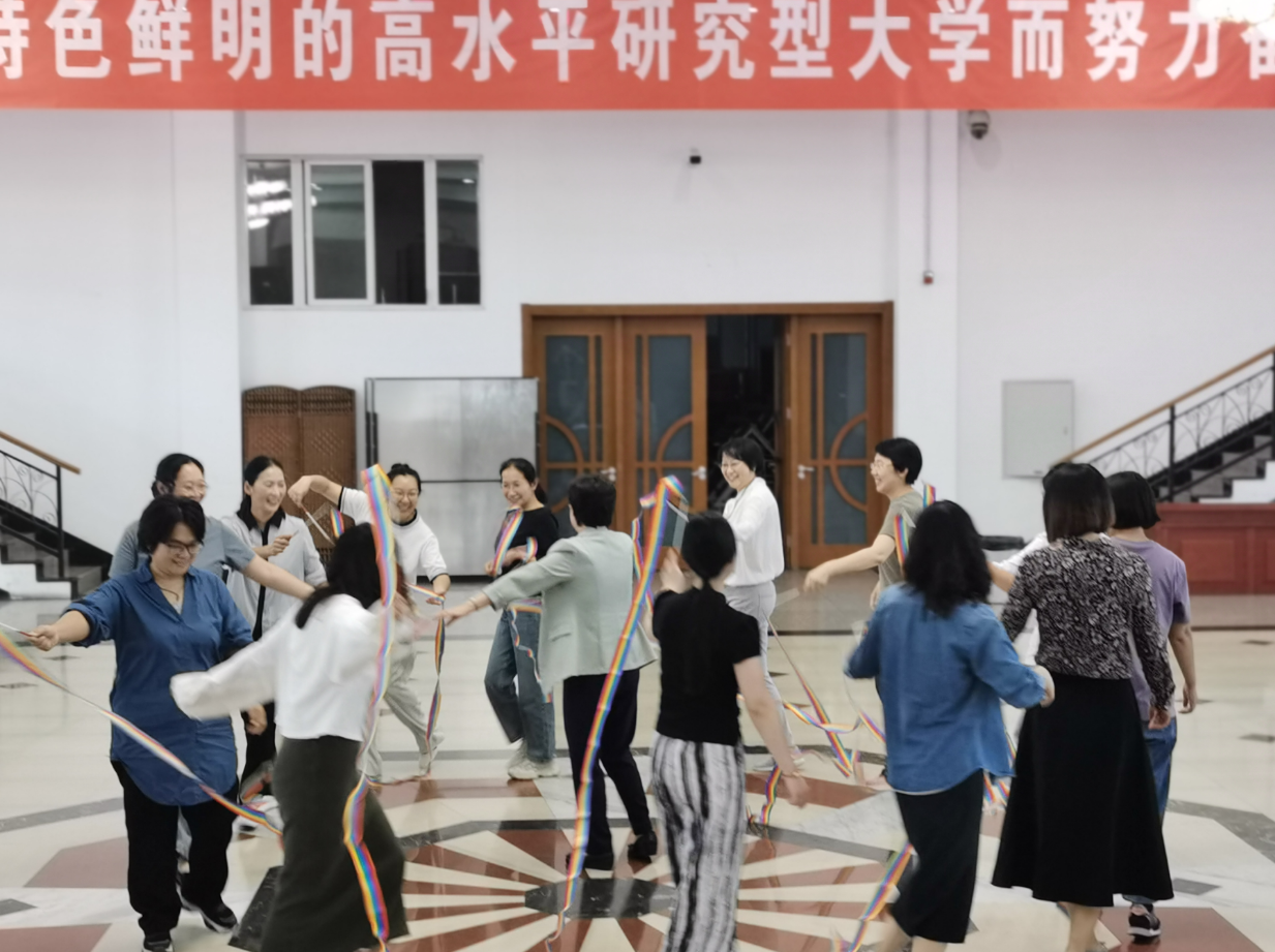活动邀请资深心理咨询师关雨桐老师现场指导,通过以舞修心的方式,引导老师们释放压力、表达感受,深入体验身心的和谐与平衡。在关老师的带领下,老师们伴随着或舒缓悠扬、或动感欢快的音乐,扬起手中的彩带,自由舞动身体,不追求表演效果和完美技巧,沉浸在各自的情境中,仿佛时而漫步在山间小径,时而在和儿时的伙伴嬉戏玩耍,从指尖到内心都得到了充分的释放,感受到了全心身放松的惬意。