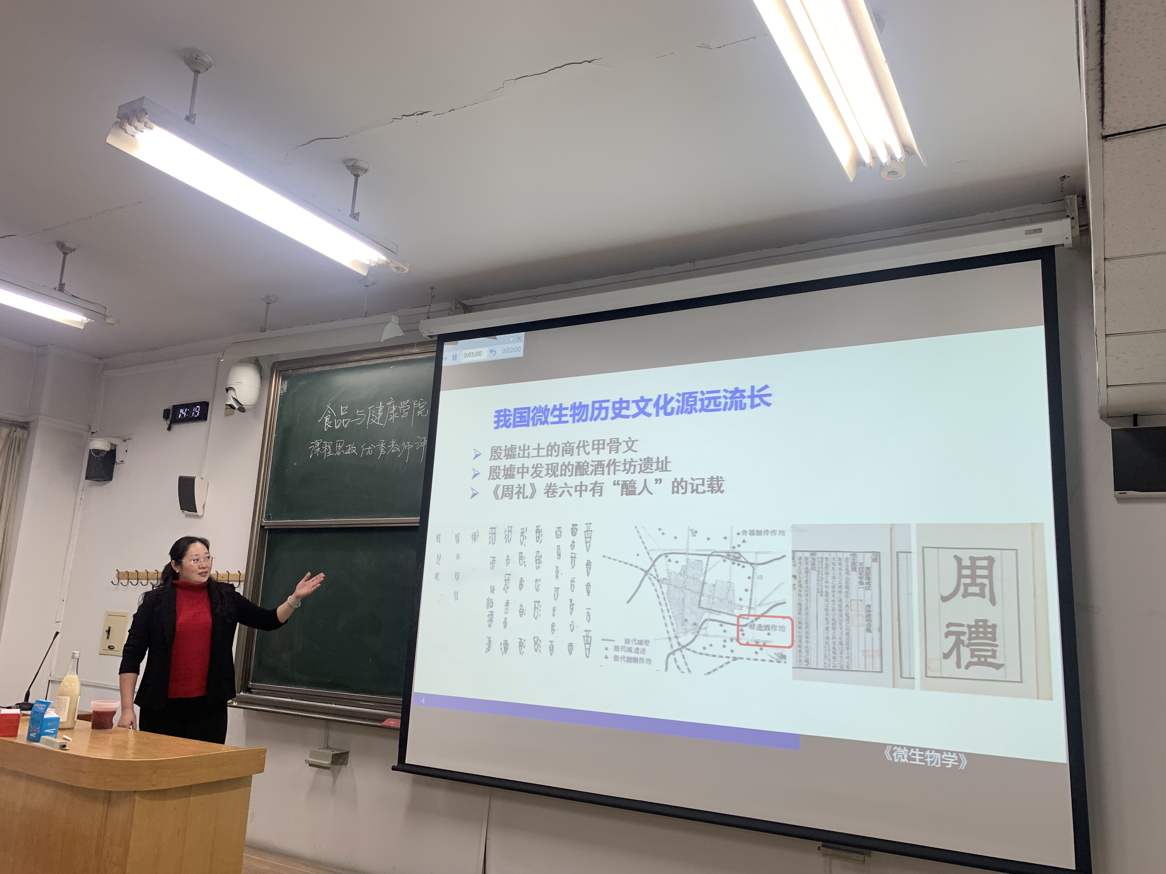 之后,六位参赛教师分别进行了15分钟的教学演示。郭天洋老师的《茶文化解析与品鉴》这门课以茶文化是我国传统文化的代表为思政切入点,介绍了在加工紧压茶的概念、分类和特色产品,生动形象地展示了茶文化在高校传统文化教育中的独特魅力。马铁铮老师讲授的是《日本饮食文化与日语口语》这门课,从文化自信、文化输出和文化认同的角度出发,带领大家感受中华饮食文化对日本饮食文化的重要影响。张婵老师的《微生物学》以殷墟出土的商代甲骨文“酒”字、《周礼》卷六中“醯人”(醋)的记载为引,展现了我国源远流长的微生物使用的历史文化,突出了文化自信。授课过程中,引用曹孟德的 “对酒当歌,人生几何”、王翰的“葡萄美酒夜光杯”等名句,展现中国人对于酒的精神追求,并以米酒的酿造为例讲授酿酒的原理和微生物在食品行业的重要地位,最后以Chinese Baijiu/Chinese Huangjiu 的外文命名为例体现了食品领域的从业者的不懈努力让中国在世界舞台拥有了更强的话语权,并鼓励员工不负韶华,将学习科学知识融入到祖国的建设当中。