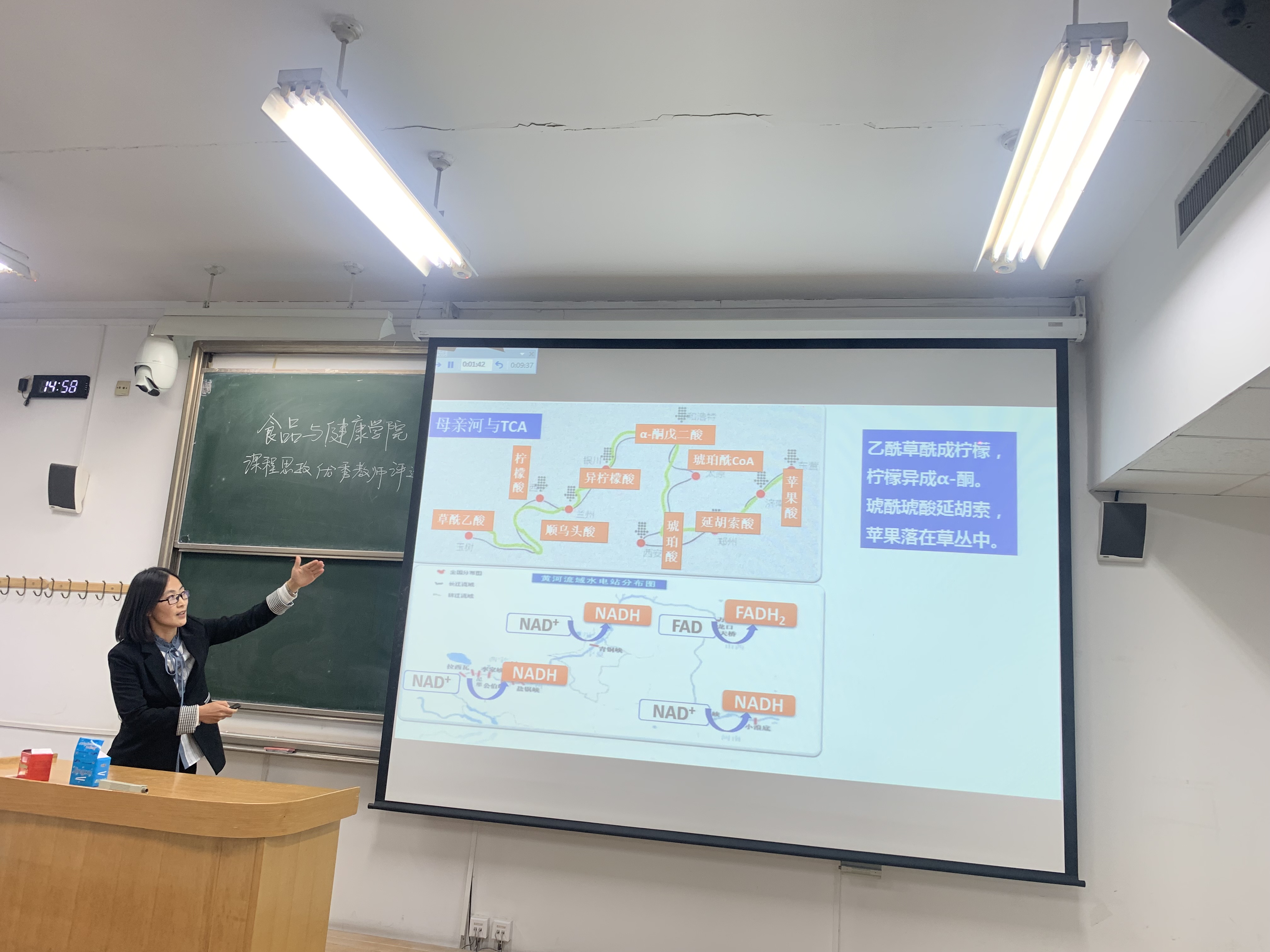 郁永辉老师讲授了《食品营养学》,从重挫英国海军的坏血病出发讲解维生素C的发现,通过对比西方航海对资源的掠夺、对殖民地的剥削与郑和下西洋构建海上贸易通路,促进周边国家经济发展和文化交流的历史,引出要懂得感恩,珍惜现在来之不易的幸福生活的思政元素。张慧娟参赛的课程是《生物化学》三羧酸循环一节的内容,将Crab cycle的产能作用与黄河流域四大水电站为祖国各地提供电力的相似点有机地结合,将能源的重要性突出,加深了同学对该知识点的记忆,课程结尾处用对科学家三羧酸循环的持续探索总结为“路漫漫其修远兮,吾将上下而求索”,鼓励员工对知识进行不断地探索,巧妙地在专业课中融入了思政的底色。李游老师的《食品化学(双语)》碳水化合物采用了全英文教学,用近期中国科学家成功利用一氧化碳合成蛋白质、二氧化碳合成淀粉两个重要科研成果展现国人在食品科学领域的自信。