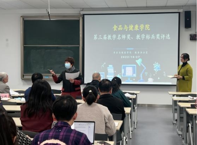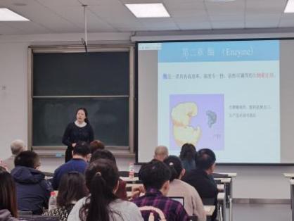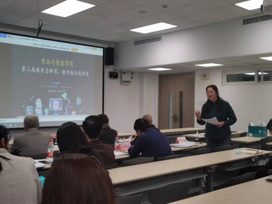 第一阶段进行的是教学名师的选拔,现场气氛井然有序,参赛教师意气风发。张敏老师从大家喜闻乐见的罐藏食品出发,带领大家一起学习了罐藏食品的热处理技术及热处理过程中食品营养成分的变化;赵芬老师以中华食药用菌菇--食药用菌中的天然活性成分为题,带领大家畅游了我国食用菌的悠久历史,呈现了形态各异、五彩缤纷的中华食用菌,并着重为大家讲解了菌菇多糖;刘英丽老师给大家讲授的是生物化学课程的脂类代谢,以时下火热的生酮瘦身法作为引入,减肥前后的图片对比激发了现场观众的热情,随后刘老师以三个问题向大家娓娓道来什么是酮体,酮体是如何生成的,以及酮体是如何被机体利用的;张明老师从新冠疫情及国家防疫政策出发,充分融入“思政”元素,提倡新冠疫苗构筑坚实的免疫屏障,着重介绍了抗体结构和功能的多样性。