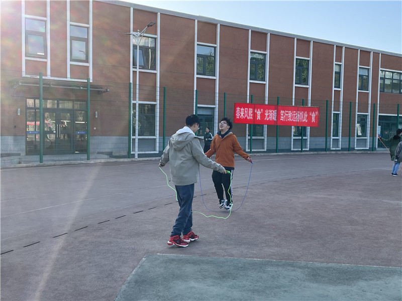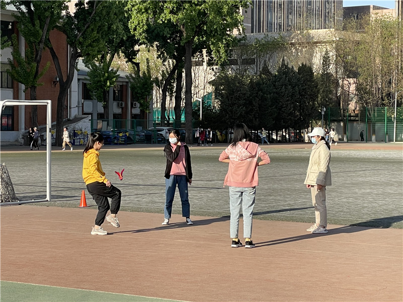 热身结束后,同学们便自由选择晨练项目:加入晨跑大军或者一起跳绳、踢毽子等。晨跑的同学们三、五结伴,呼吸着新鲜空气,感受着清晨的凉爽,在操场上留下恣意的汗水;跳绳的同学们各显神通,有的跳单摇、有的跳双摇、有的跳花绳,跳绳在大家手里变换着花样,在空中划出优美的弧线;踢毽子的同学四五个人围成一圈有说有笑,互相“传球”,玩的不亦乐乎。