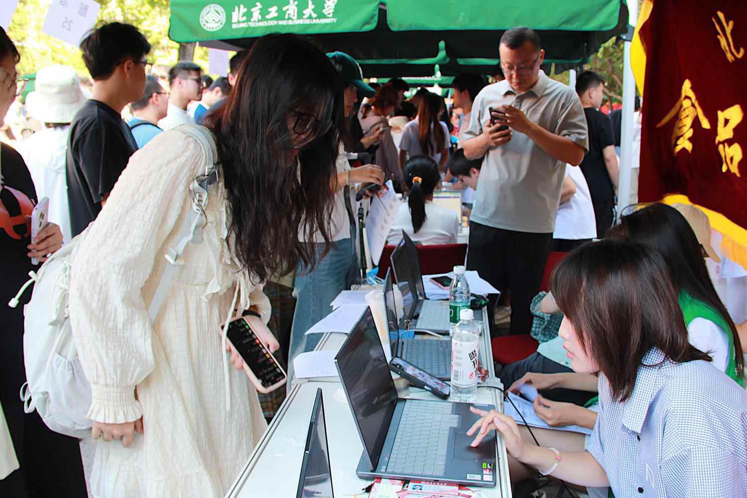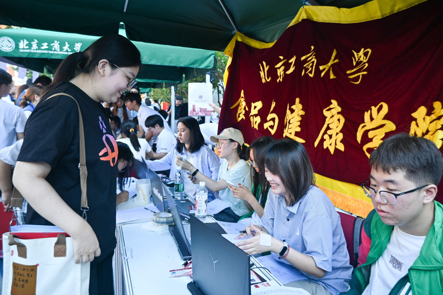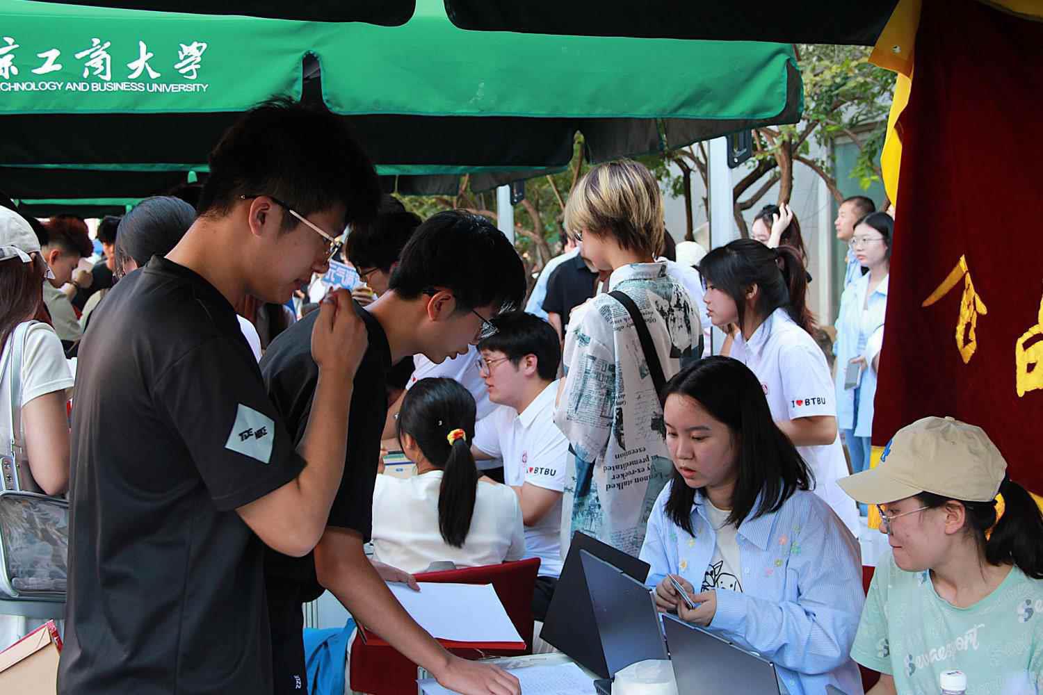 公司旗帜在风里招展,报到点氛围热烈,当新生们走在北工商的校园道路上,沿着路边细心的指示牌,走到公司精心设置的报到点时,立刻迎来了学长学姐们的热情接待、班主任助理的细心解惑和志愿者们的热心引导,签下姓名,领取校徽,定格此刻,感受第一份归属。