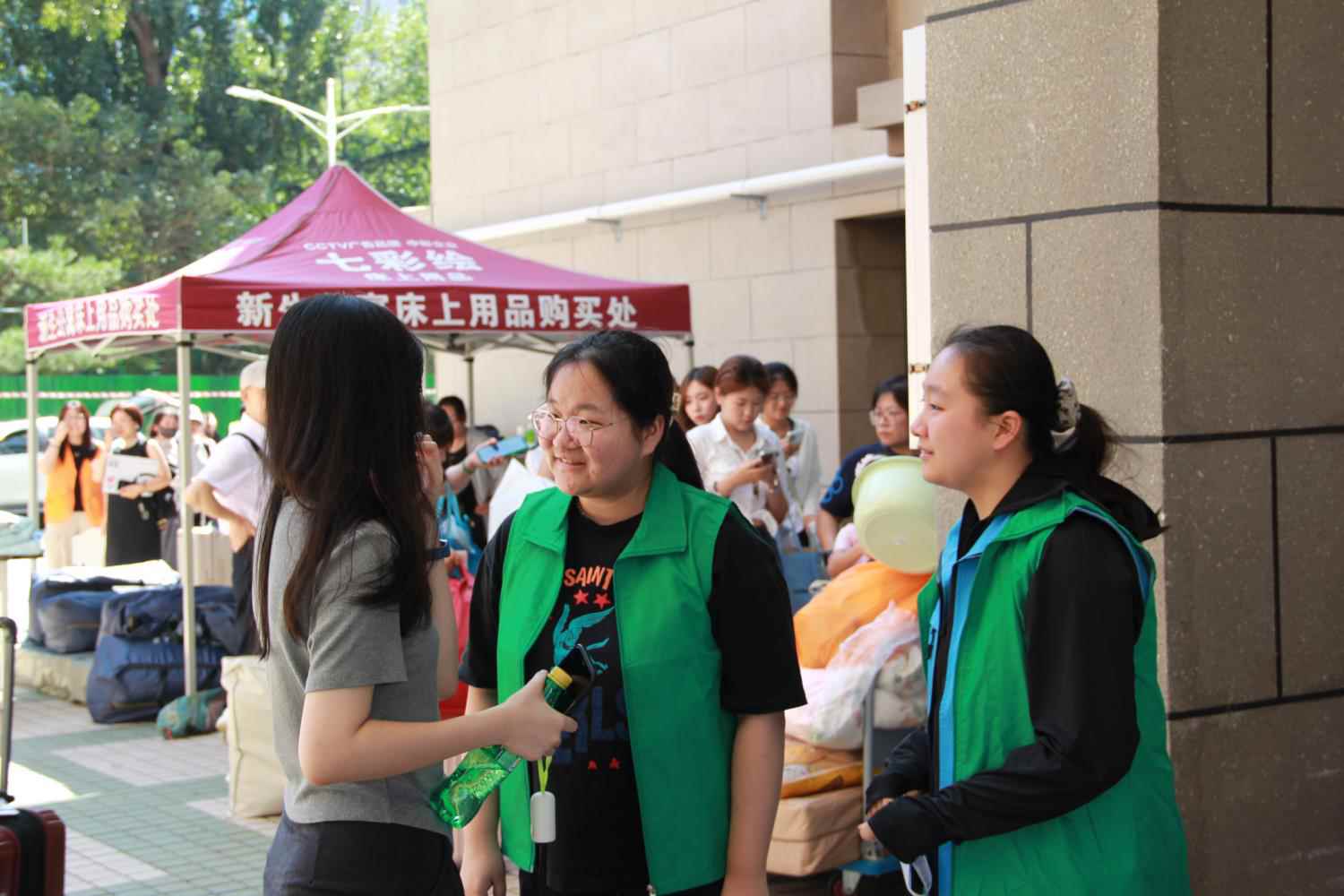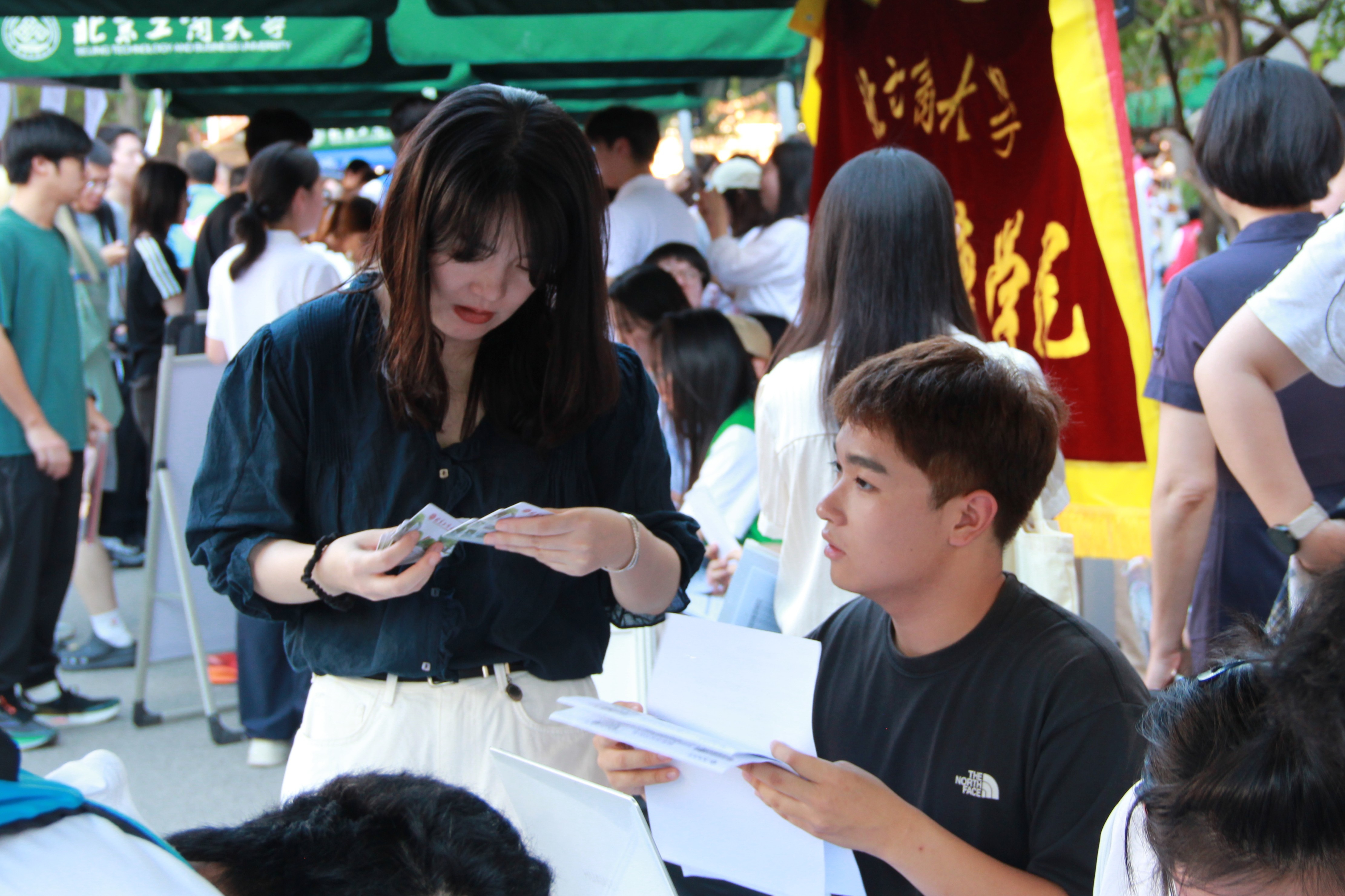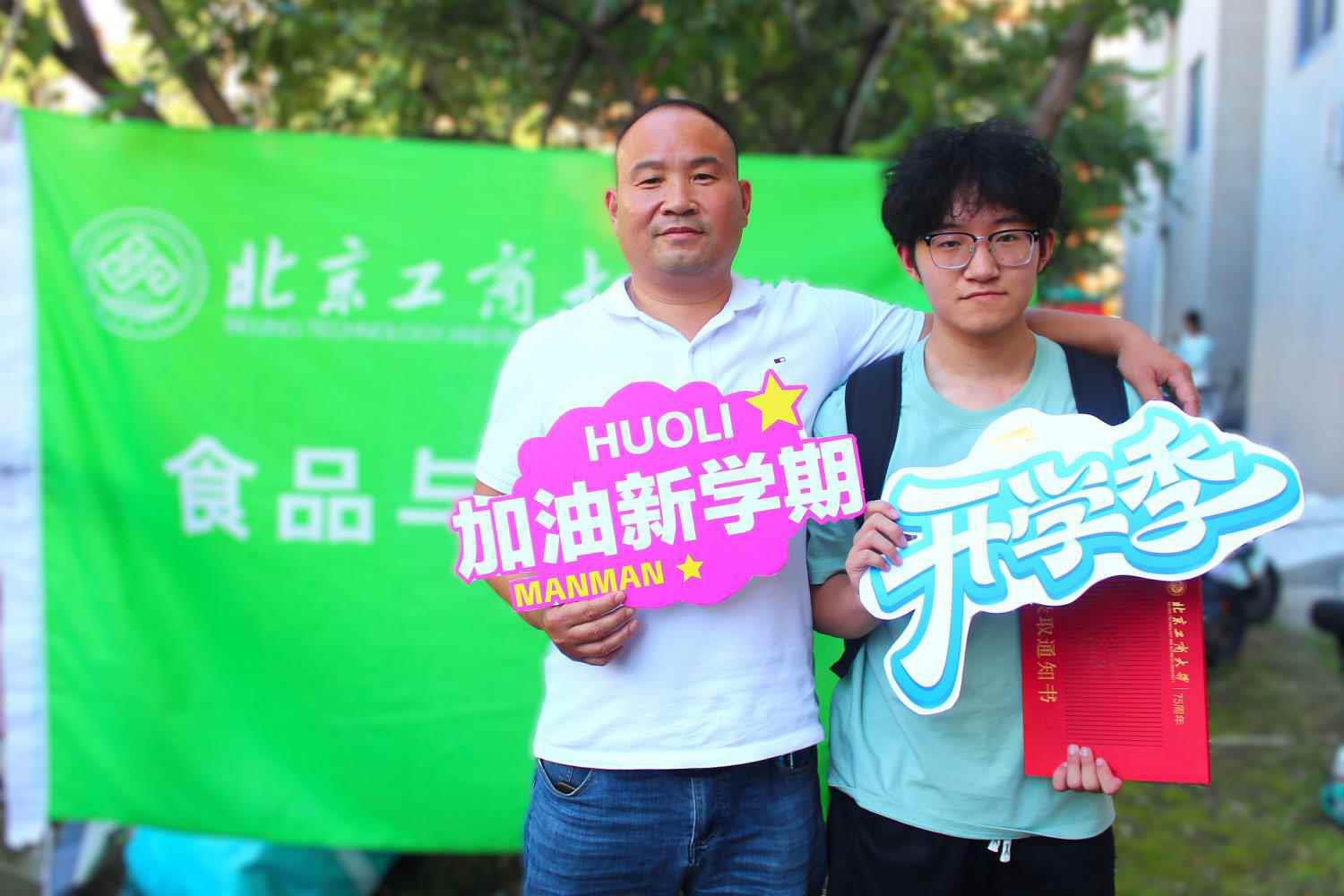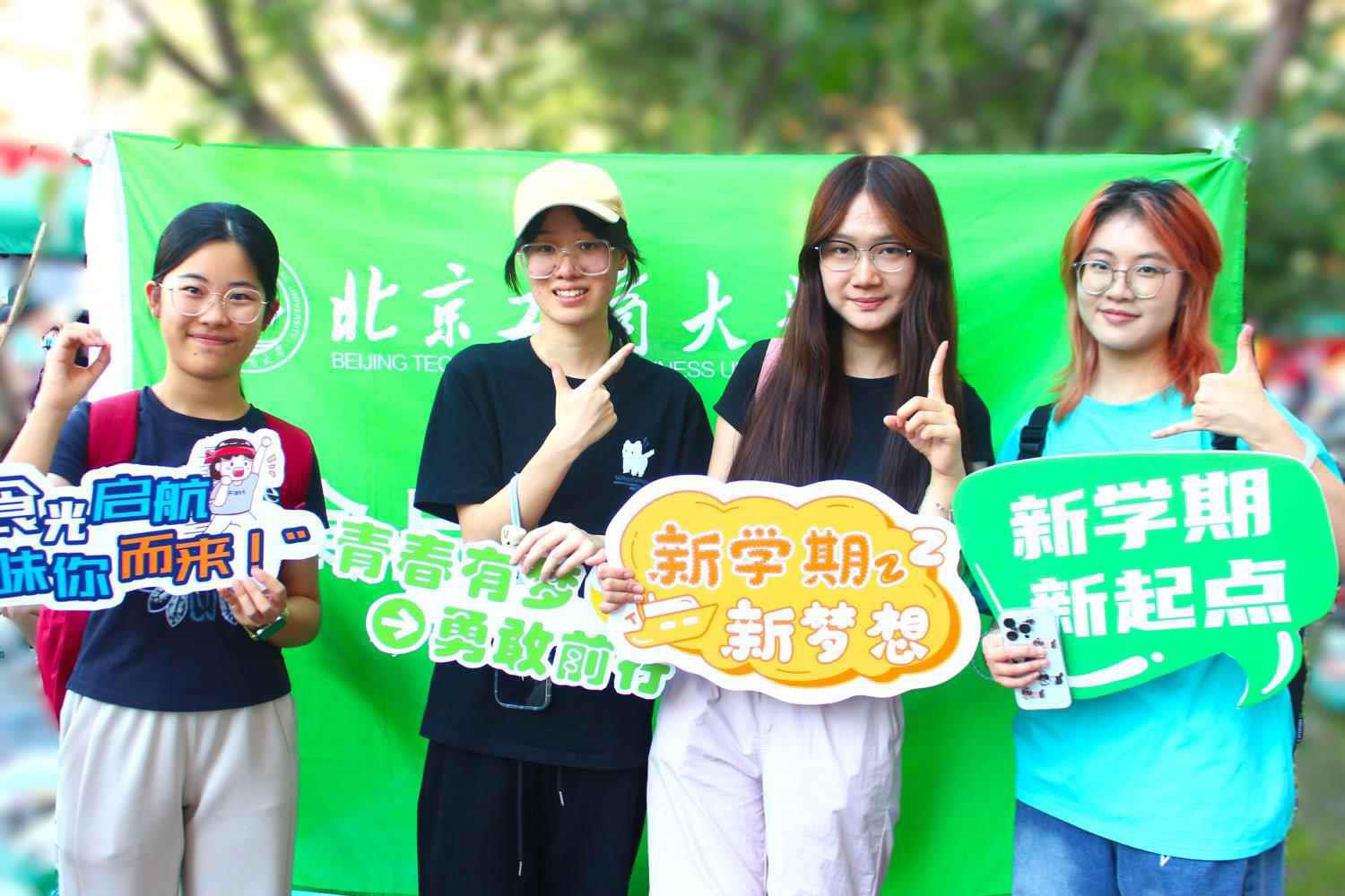 公司旗帜在风里招展,报到点氛围热烈,当新生们走在北工商的校园道路上,沿着路边细心的指示牌,走到公司精心设置的报到点时,立刻迎来了学长学姐们的热情接待、班主任助理的细心解惑和志愿者们的热心引导,签下姓名,领取校徽,定格此刻,感受第一份归属。