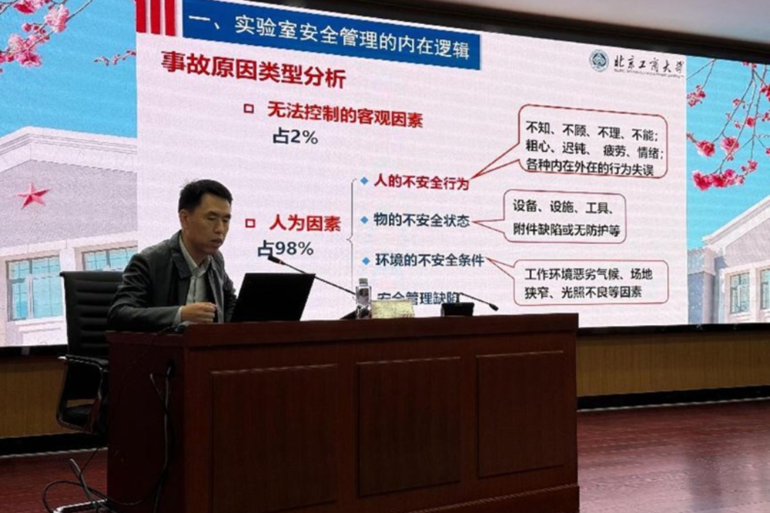 杨立功围绕“实验室安全管理的内在逻辑”“法律法规要求”“主要问题及对策”三个方面进行了全面宣讲。他结合《中华人民共和国危险化学品安全法》《安全生产治本攻坚三年行动方案(2024-2026年)》等文件要求,详细解读了高校实验室安全管理的责任体系、风险防控机制及隐患排查重点。通过典型事故案例和数据分析,指出实验室安全管理中存在的突出问题,如“安全压力传导不足”“设备使用不规范”“化学品管理混乱”等,并针对性提出整改对策:一是强化制度建设,完善安全操作规程和应急预案;二是加强教育培训,提升师生安全意识和应急处置能力;三是优化实验室布局,确保安全设施有效运行。他强调,实验室安全是高校教学科研工作的生命线,必须坚持“安全第一、预防为主、综合治理”的方针,严格落实“双重预防机制”,将风险控制在隐患之前,把隐患消灭在萌芽状态。