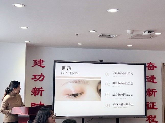 此次妇女节主题活动邀请到了来自轻工科学与工程公司、化妆品系的张佳婵老师,张老师进入化妆品系已有十余年,承担和参与了多项企事业课题,发表多篇化妆品领域高水平论文。张老师以“肌肤护理基础小课堂”为主题,从了解你的皮肤结构、测试你的皮肤类型、适合你的护肤方式、挑选你的护肤产品四个方面给女教工们呈现了一节生动丰富的肌肤护理科普讲座。从认识皮肤结构入手,针对不同肤质特点,分享不同的护理要点,带领女教工们一同甄别火出圈的美容谣言。女教工们热情高涨,大家就各自皮肤的护理技巧等问题展开了热烈讨论和经验交流,在一片欢声笑语中度过了这次难忘的三八国际妇女节。