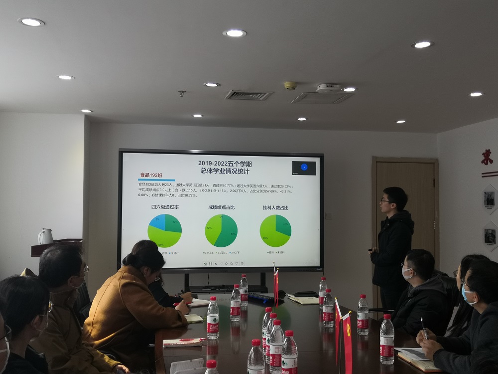 会上,2018级本科生辅导员揣清新、2020级本科生辅导员何丽娟、2019级和2021级本科生辅导员潘梓逸分别介绍了各班员工的整体学业情况,包括学习成绩分布数据、四六级通过率、学业重点帮扶对象等,分析了员工出现学业问题的原因,帮助班主任深入了解班级和员工实际情况,针对性的开展班级工作,引导员工直面学业痛点,更好的为员工答疑解惑。
