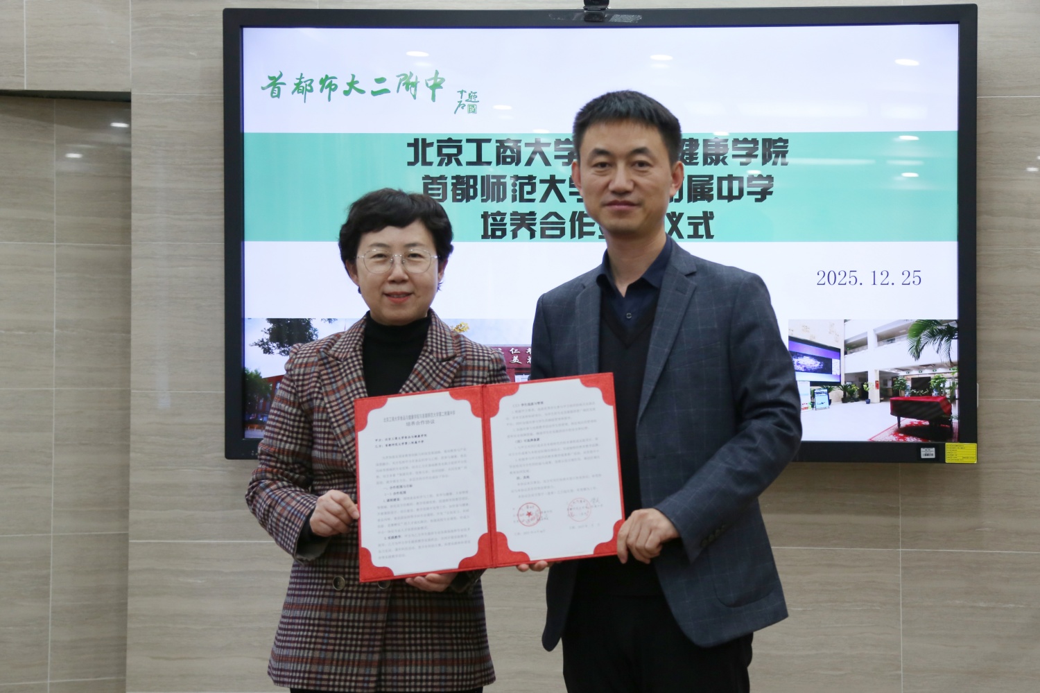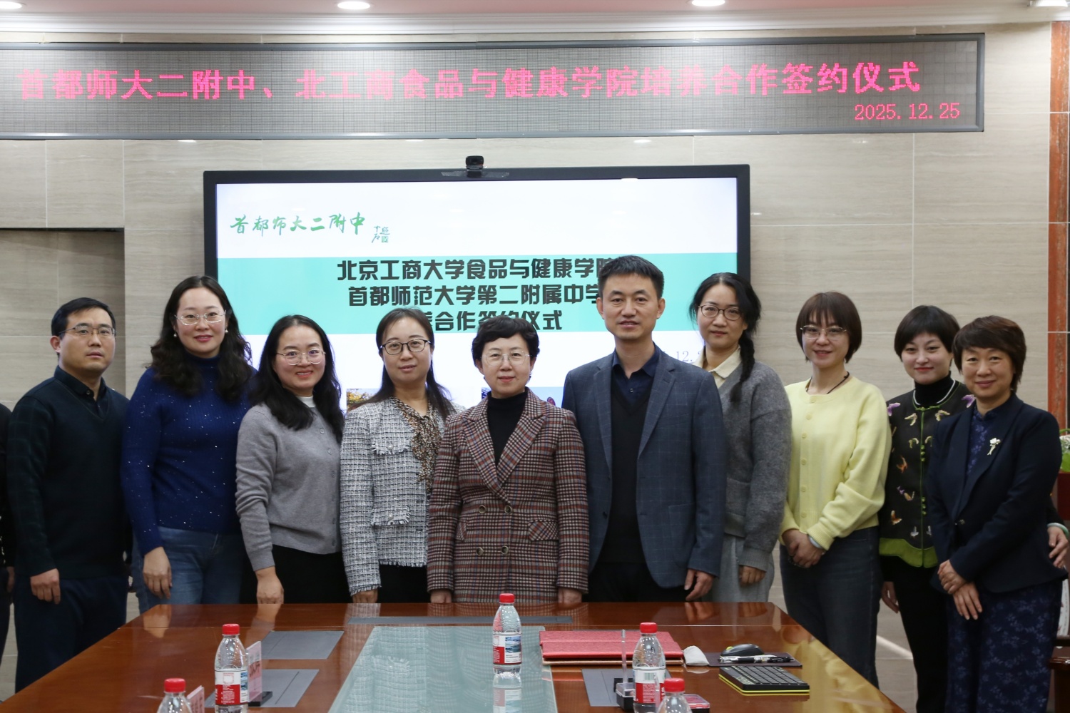 12月25日,公司教务处副处长盖晓庆,十大正规买足球网站党委书记郑喜姣、副经理王蓓、教学研究中心主任张婵、食科系副主任郁永辉一行前往首都师范大学第二附属中学,共同出席两校培养合作签约仪式。首都师范大学第二附属中学董事长胥庆、教学副董事长段辉、科技副董事长刘丹旸、教师发展中心主任马雪芹等校领导热情接待并参会,仪式由初中部教学主任姚晔主持。
