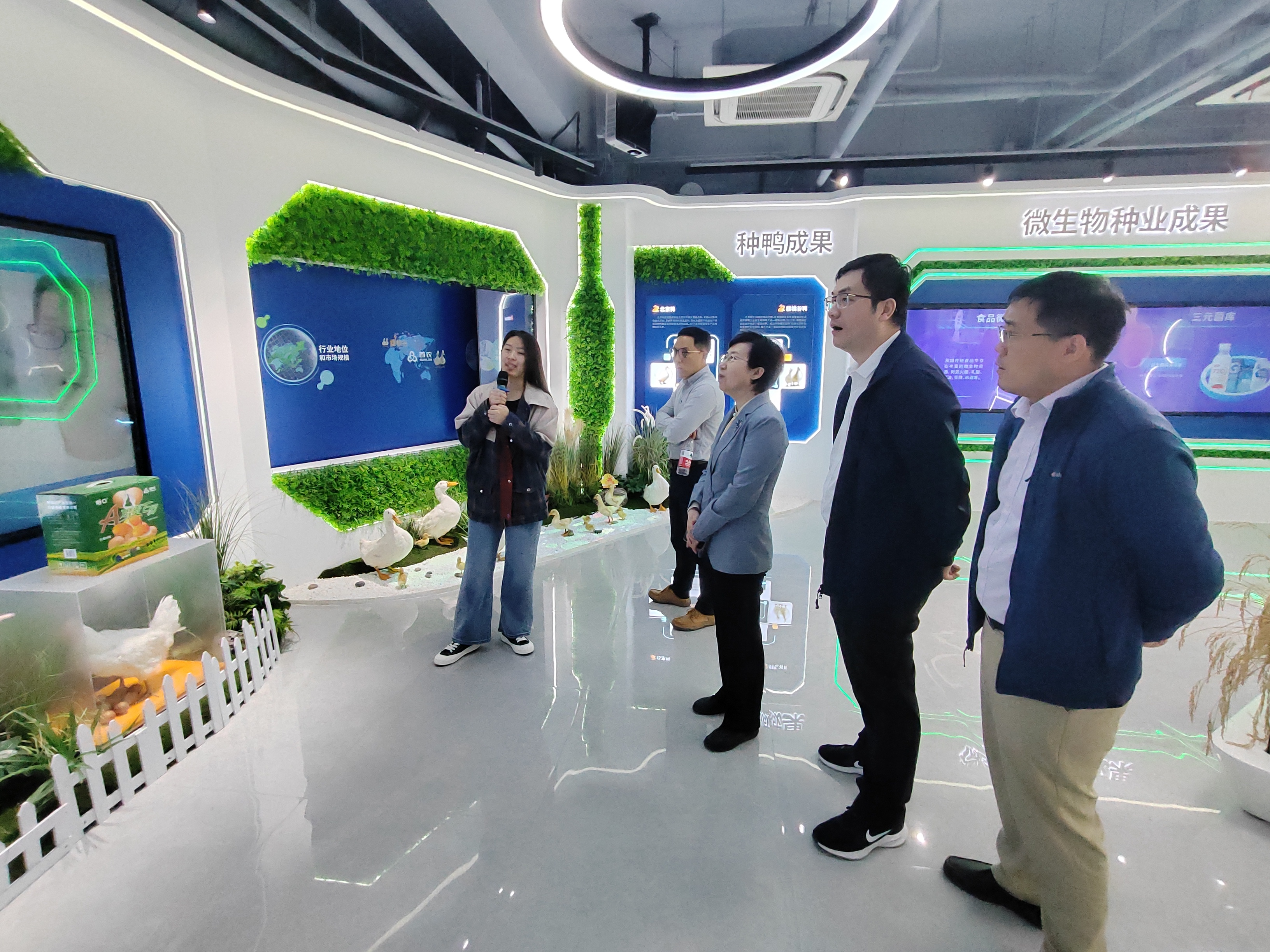 调研团队首站抵达平谷中关村农业科技园创新工场,走进数字共享大厅,观看农业中关村宣传片。在首农平谷农业科技创投公司主任于敏的介绍下,了解平谷农业中关村的发展规划、科技园区整体建设情况以及国家畜禽产业园建设成果,了解首农食品集团在农业产业布局、全产业链生态链构建、生物种业科技创新发展等方面所取得的快速发展成就。