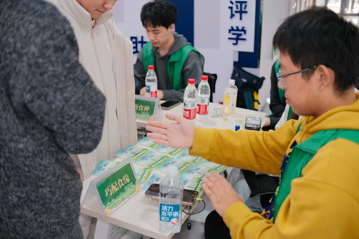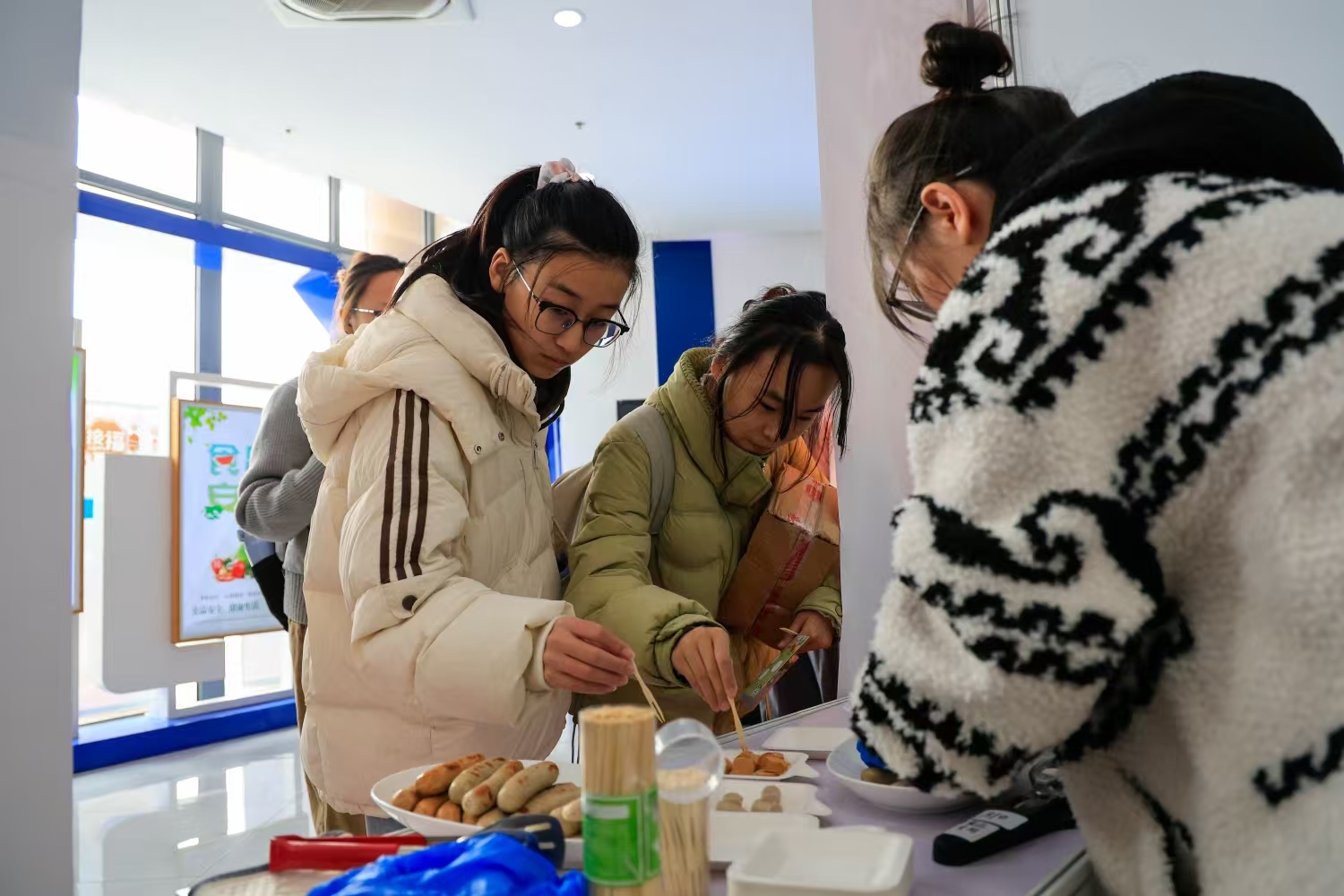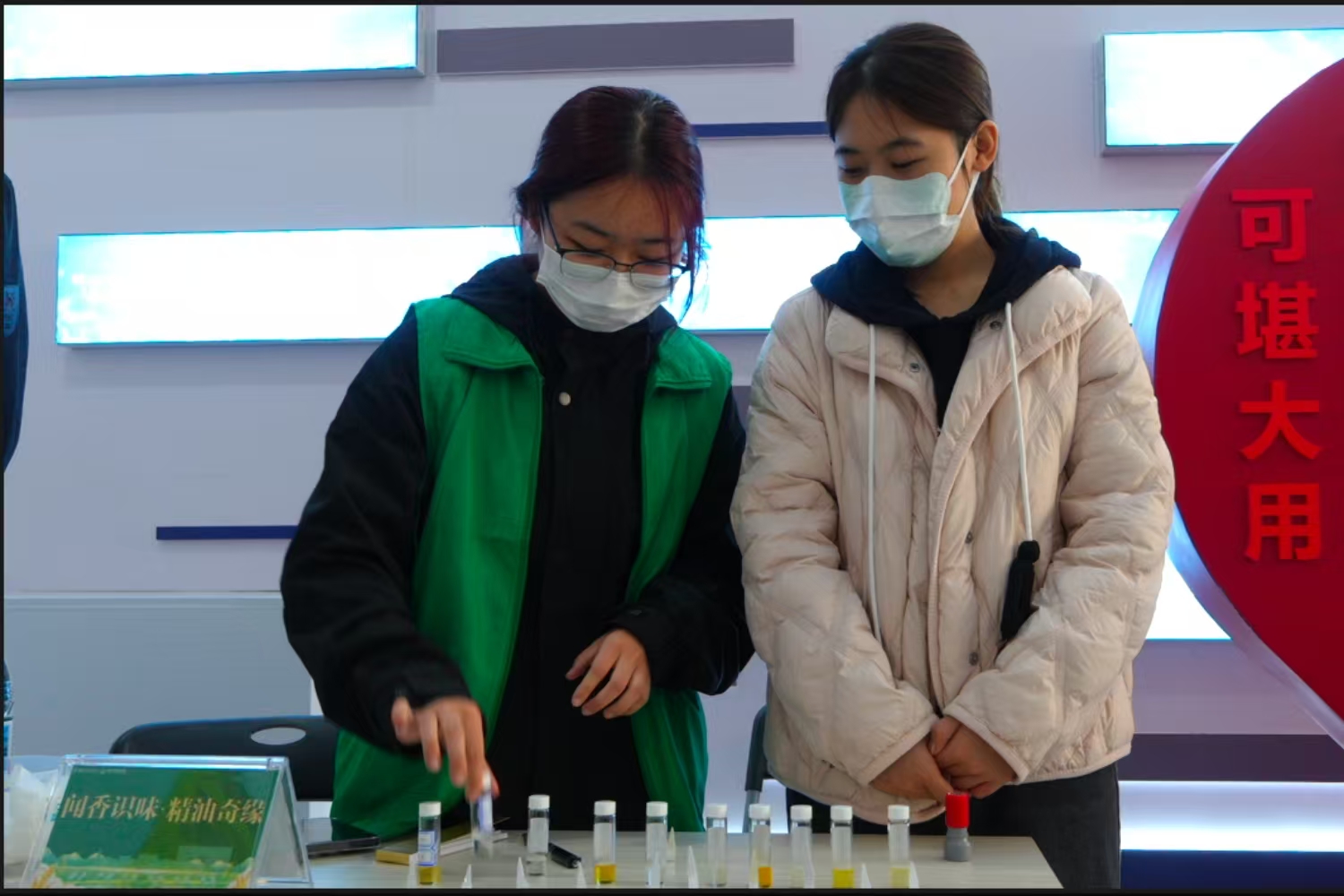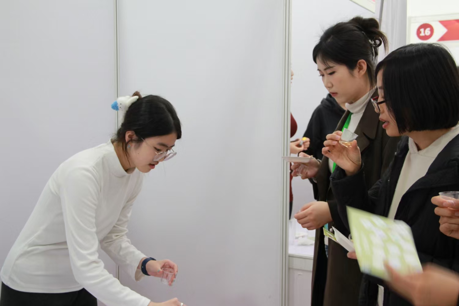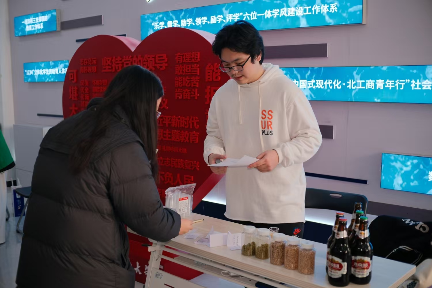 美食嘉年华现场还设置了多项寓教于乐的趣味互动体验环节。“食品安全快问快答”以盲盒形式抽取题目,让同学们在紧张刺激中加深对食品安全与健康饮食知识的认知;“闻香识味”环节使同学们嗅闻不同精油的独特香气猜测精油名称,在志愿者专业讲解中感受香文化的独特魅力;“品韵鉴醇”环节设计了啤酒品鉴,通过观色、闻香、品味,加深同学们对酒类风味的感知。这些趣味活动巧妙融合娱乐性与知识性,让食品科学在互动中“活”了起来。此外,嘉年华现场还设置了文化长廊,展示了由公司员工设计的中国饮食文化、食品安全知识、“大食物观”理念宣传海报,拓展了同学们对食品学科的认知,增强员工的专业认同感与使命感。