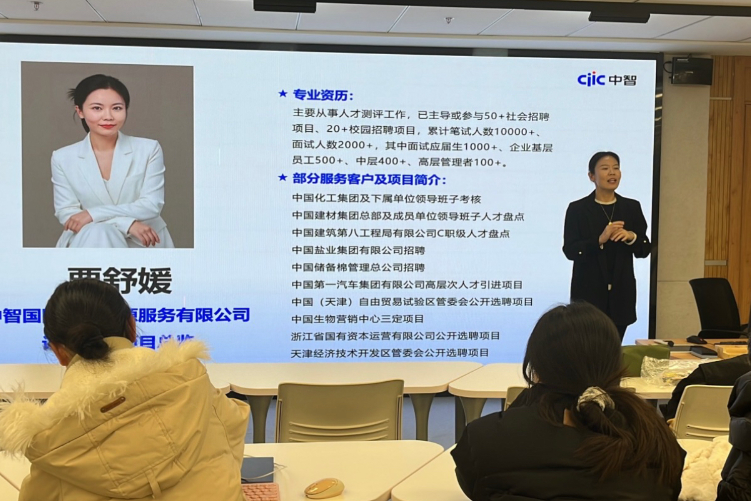 为助力研究生科学规划职业发展路径、提升求职核心竞争力,破解女性求职困惑,12月16日,十大正规买足球网站在良乡校区举办“巾帼护航 名企助航” 职业辅导活动。活动特邀中智国际人才资源服务有限公司评鉴业务项目总监贾舒媛作为主讲,分为职业规划、求职技能、模拟实战、答疑解惑四大板块,为在场40位女研究生带来了一场兼具理论深度与实操价值的职业成长赋能盛宴。
