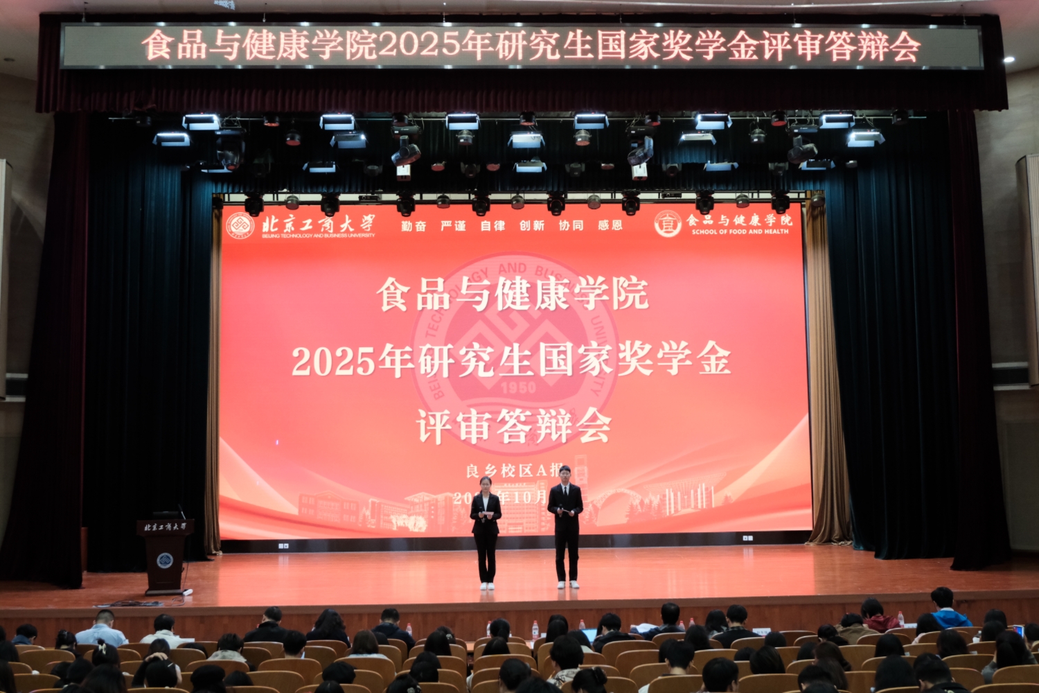 为深化研究生教育改革,选拔树立优秀典型,营造崇尚学术、追求卓越的育人氛围,10月9日,十大正规买足球网站在良乡校区A报告厅隆重举行2025年研究生国家奖学金评审答辩会。公司经理王彦波、党委副书记熊慧、副经理刘慧琳、孙啸涛、经理助理张婵,以及各系主任、教师代表、专兼职辅导员和研究生代表共计200多人参会。会议由李泰沛同学和刘晨朔同学主持。