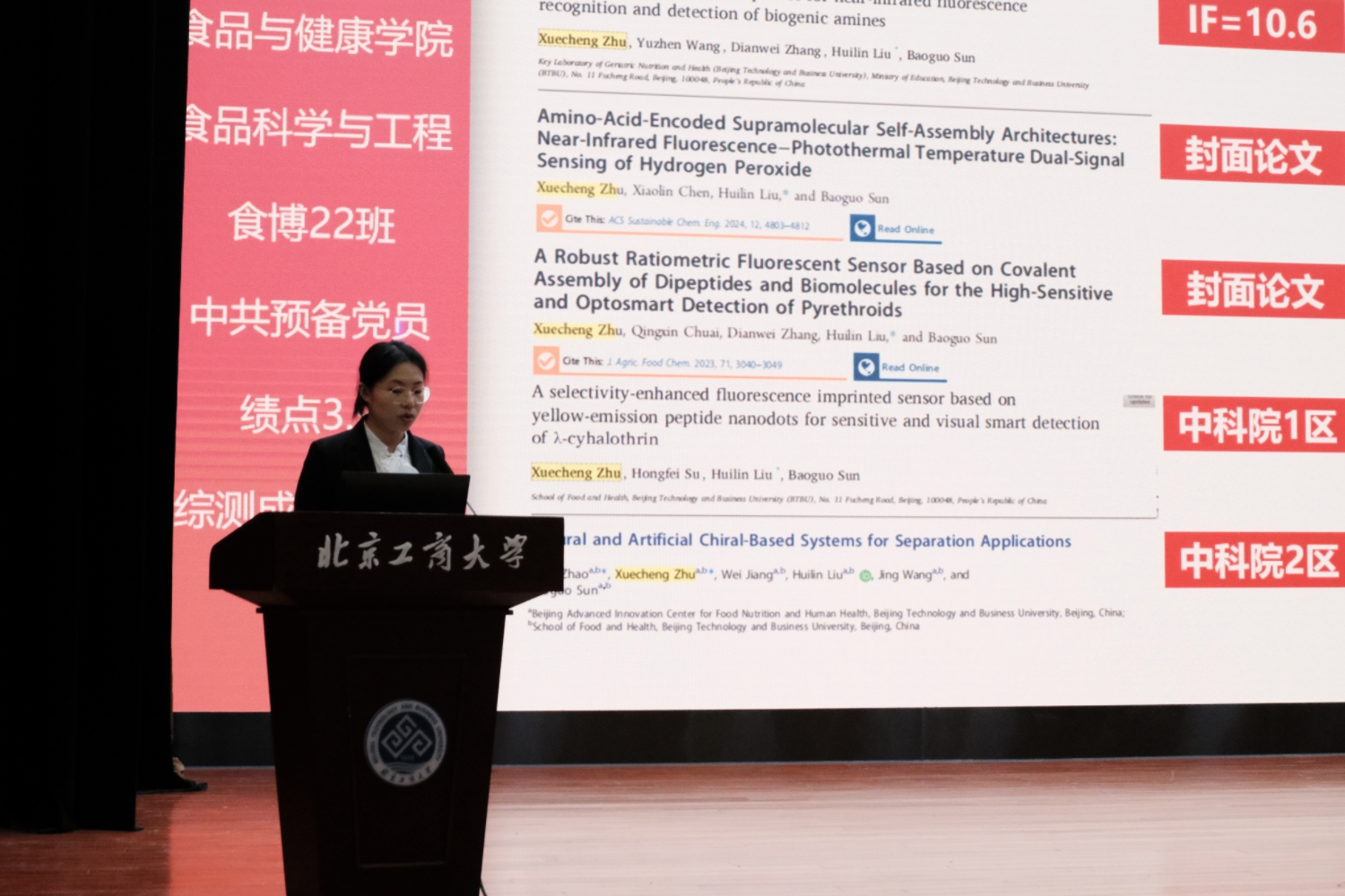 按照“公平、公正、公开、择优”的原则,答辩分为博士组、学硕组和专硕组三个类别依次进行。共有30名候选人参与答辩,包括博士研究生9人、学术型硕士8人、专业型硕士13人。在限时3分钟的陈述中,候选人围绕思想品德、学业成绩、科研与实践成果、发展潜力等方面展开汇报。在紧张而有序的答辩会上,优秀学子们尽展风采,他们围绕学业成绩、科研创新与社会实践等多个维度,全面而精炼地汇报了自己在过去一学年中的成长与收获。在学业方面,候选人们展现了扎实的专业功底,多位同学学业成绩名列前茅;在科研领域,李忍同学自入学以来,以第一作者身份累计发表SCI论文9篇,全部为中科院TOP期刊论文,其中3篇影响因子超过10,1篇入选高被引论文;获得授权发明专利1项,参编学术著作1部,该著作已被隆平水稻博物馆永久收藏;同时,担任Journal of Cereal Science、Natural Product Communications和Applied Food Research等多个国际期刊的审稿人。在学科竞赛方面,孙璐瑶同学作为核心研发人员及答辩成员在第十九届“挑战杯”全国老员工课外学术科技作品竞赛“揭榜挂帅”专项赛中获国家级特等奖及项目擂主;在“互联网+”“青创北京”“京彩大创”等各类竞赛中均荣获省市级以上奖项。在社会实践与综合素质方面,多位候选人分享了在员工工作、志愿服务、社会调研、企业实习等方面的丰富经历,展现了新时代研究生知行合一、担当奉献的全面素养。
