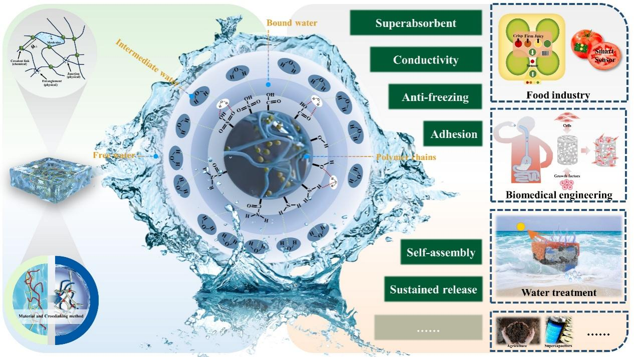 水凝胶(Hydrogels)是一系列具有三维交联网络和多孔结构的含水、软性材料,因其多样的功能特性(如超高溶胀特性、高韧高强等机械特性、可逆自愈特性、流变与黏附特性、智能响应特性等)以及在功能因子递送载体、生物医药材料、食品智能包装与食品感官设计、组织工程材料、生物传感器、软体机器人和制动器、可穿戴电子器件等众多领域的广泛应用潜力而备受关注,是材料学研究的热点。水凝胶以水(或水相溶液)为分散相,自“水凝胶”一词首次出现以来,水与水凝胶就有着千丝万缕的联系。水是水凝胶的组分核心,也是其结构基础。