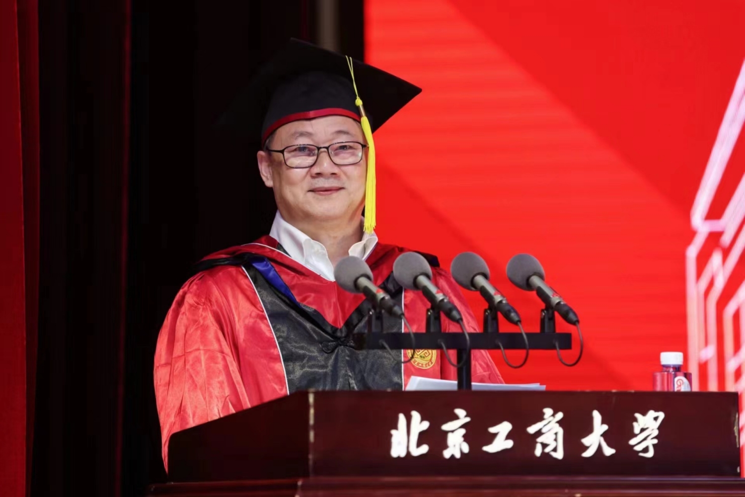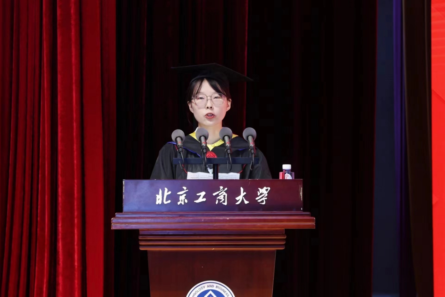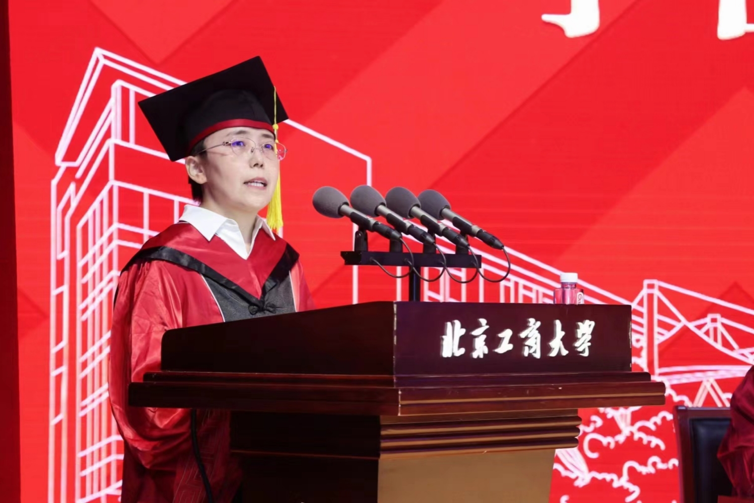 典礼庄严的国歌声中拉开帷幕。毕业纪念视频短片将同学们带回初入校园追逐梦想的青春旅程,一幅幅画面定格美好的校园时光,毕业生们回忆了在北工商的成长和收获,表达了对母校的依依不舍和对未来的美好憧憬。