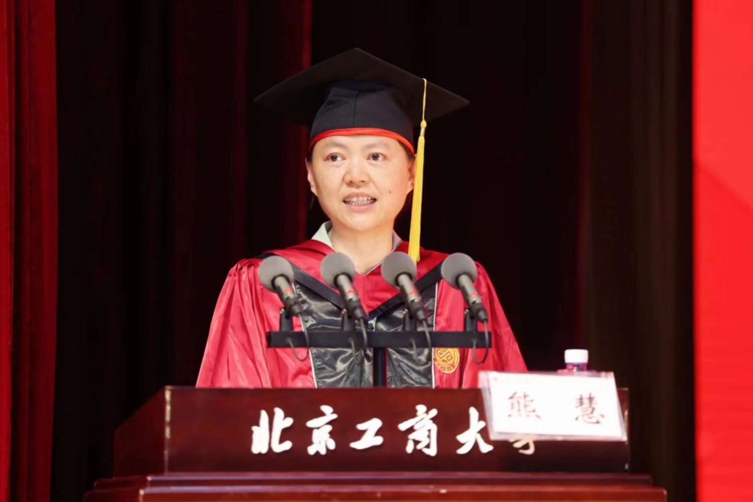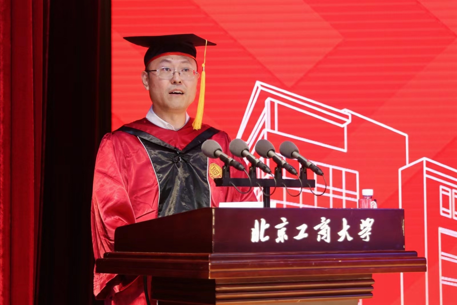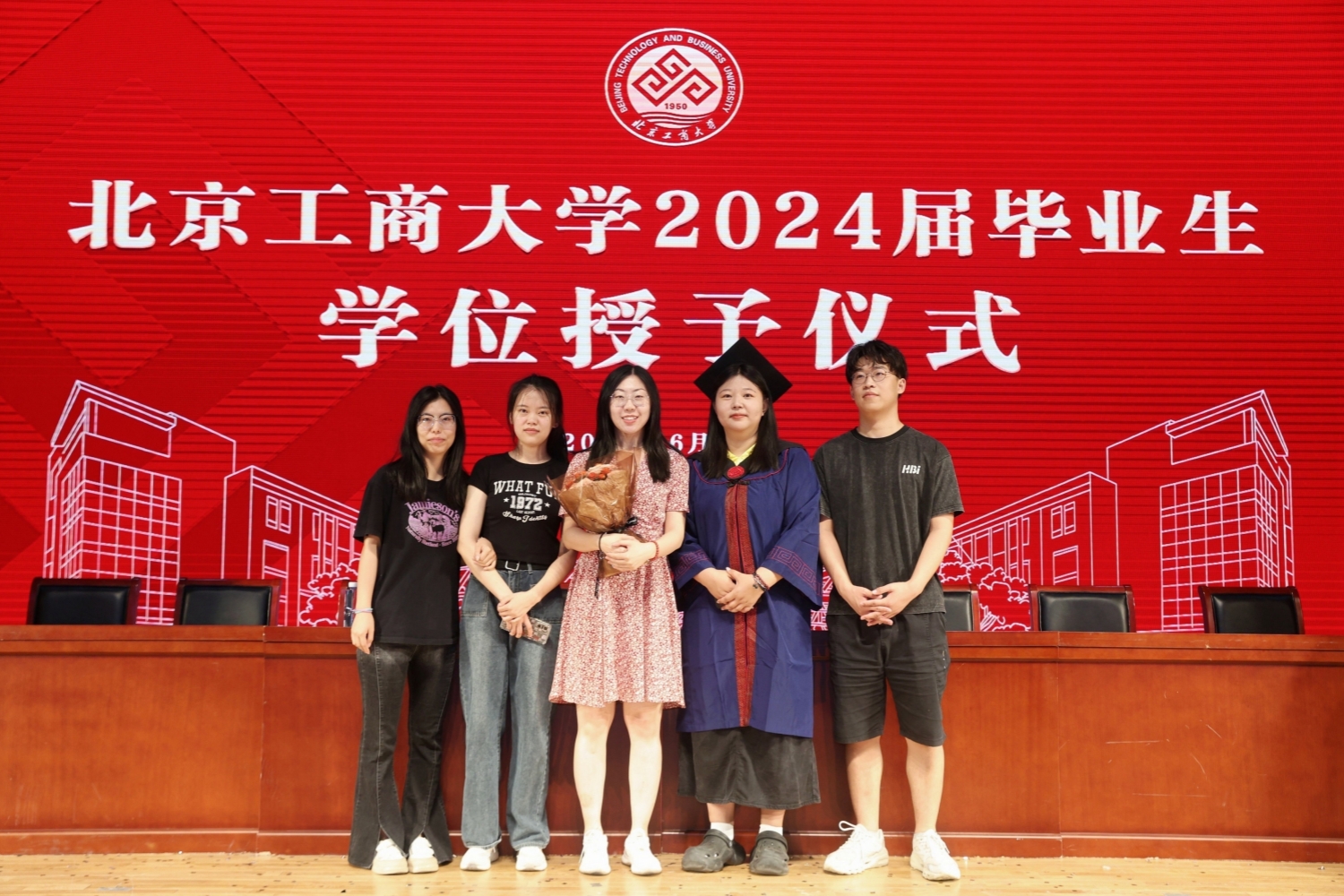 典礼庄严的国歌声中拉开帷幕。毕业纪念视频短片将同学们带回初入校园追逐梦想的青春旅程,一幅幅画面定格美好的校园时光,毕业生们回忆了在北工商的成长和收获,表达了对母校的依依不舍和对未来的美好憧憬。