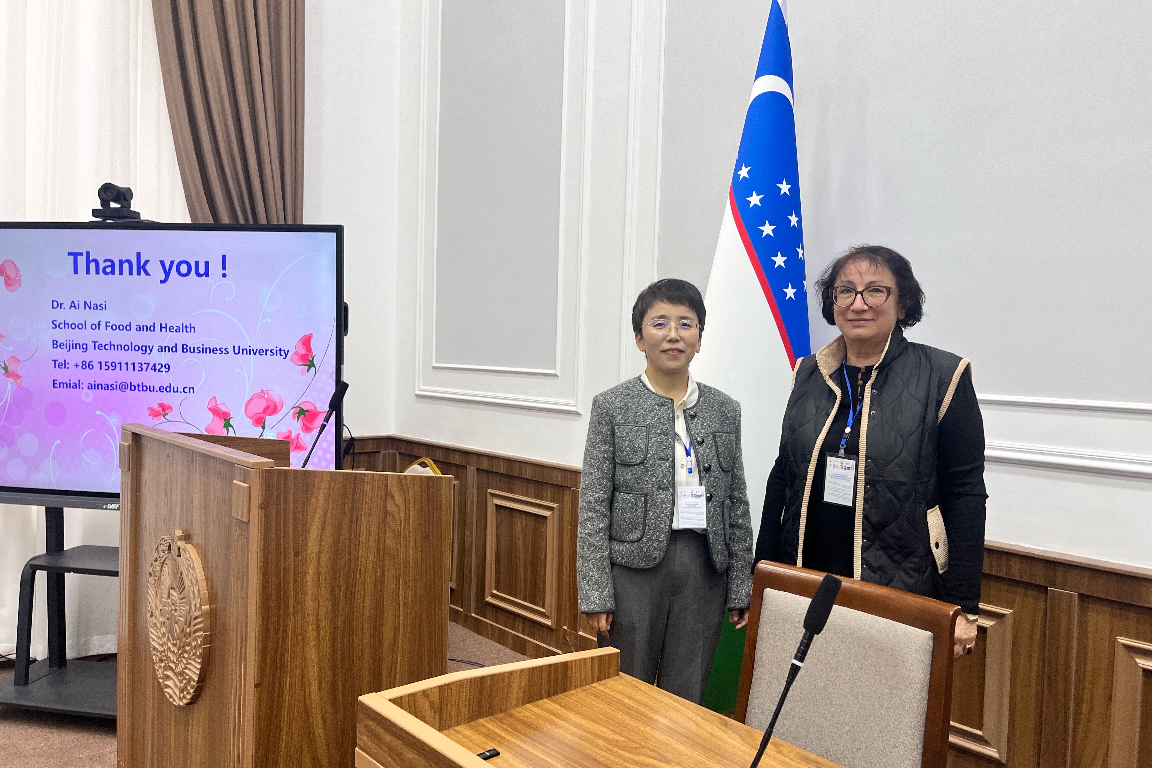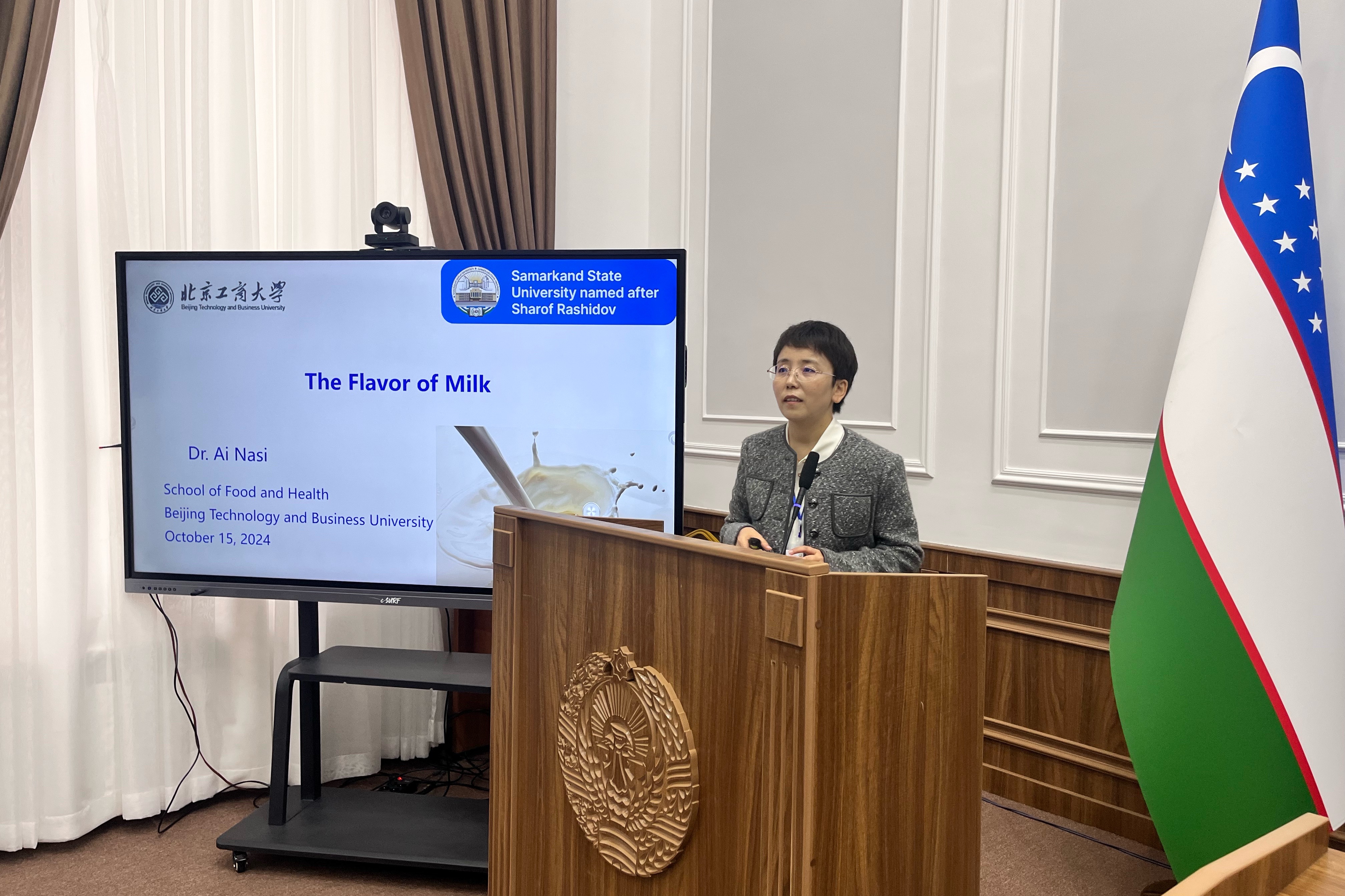 访问期间,李健一行参加了在乌兹别克斯坦撒马尔罕国立大学举办的国际会议Vl International Scientific and Practical Conference“Food Security: Global and national problems”,大会在萨纳库洛夫(Sanaqulov A.L.)教授等知名学者的主持下拉开序幕,来自意大利、俄罗斯、吉尔吉斯坦、塔吉克斯坦、哈萨克斯坦等全球各地的专家学者就食品安全、食品风味领域的创新成果进行了展示和交流。艾娜丝作题为“The Flavor of Milk”的报告,该报告基于食品风味,乳品风味现状、来源、困境及乳风味改善等方面进行了系统汇报。