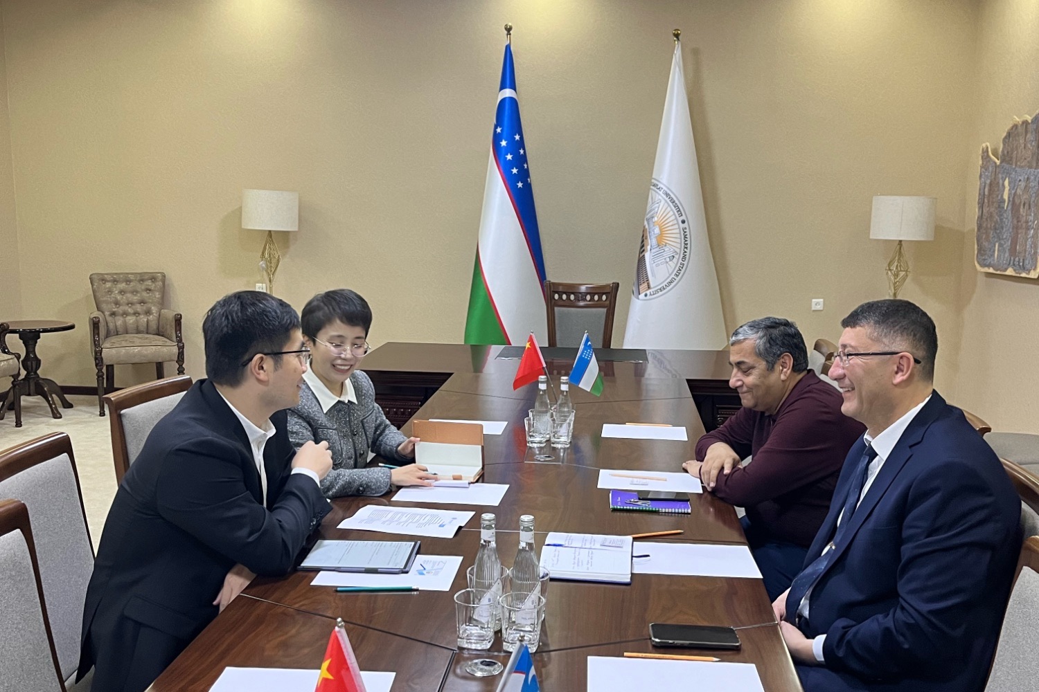 代表团首先访问了乌兹别克斯坦撒马尔罕国立大学。李健与该校副董事长阿克马尔·阿哈托夫(Akmal Akhatov)进行了会谈。双方介绍了近年来的发展概况和未来发展方向,就员工联合培养、教师互访、科研平台共建以及合作办学等领域的合作进行了深入交流,并达成合作共识,乌兹别克斯坦撒马尔罕国立大学主管国际事务负责人穆合塔尔·纳西罗夫(Muhtor Nasirov)陪同参加了会谈。