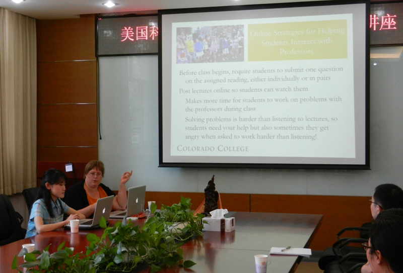 Lostroh教授从科罗拉多文理公司的发展历史、本科专业设置、本科课程设置及评价体系、如何进行互动教学等方面展开了详细的介绍,并以所教授的专业课程为例,细致解读了“翻转课堂”的教学体制,如何进行有效的课堂提问,如何科学地分配讨论组,如何让互动教学更有成效。科罗拉多文理公司旨在培养具有批判性思维、具有发现及解决问题能力的员工,该校在本科教学及科研等方面积累了丰富的经验,是各综合性大学研究生院优秀生源的重要输送来源。科罗拉多文理公司为一年两学期制,每学期上四门课,每门课集中在1个月讲授。她的报告视角独特,观点鲜明,见解独到,语言风趣,展现了深厚的理论功底和渊博的学养风范,引发了与会者阵阵掌声和共鸣。