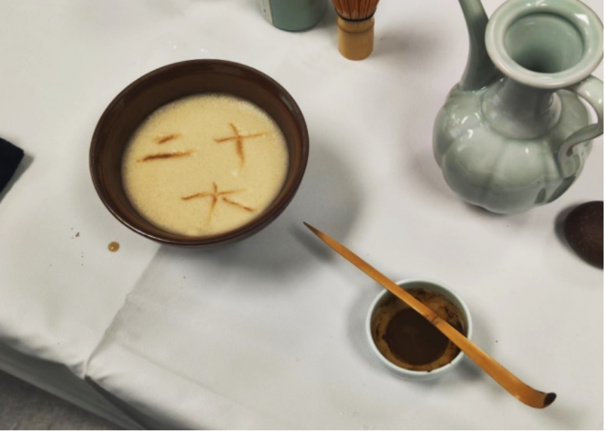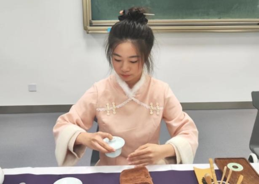 何亚荟老师则以当下大火的电视剧《梦华录》中“赵盼儿”的点茶过程为教材,从茶的历史演变、点茶的介绍、点茶的操作流程以及分茶技法这四个方面,让大家充分了解“点茶”;并亲自示范点茶全过程。同时在点好的茶上手写“二十大”,用实际行动庆祝党的二十大胜利召开。