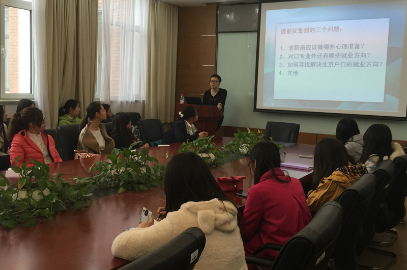 4月1日,就业指导中心教师李丹丹在阜成路校区作了题为“老员工就业心理准备与辅导”的讲座。讲座伊始李老师通过“自己告诉自己”的游戏让同学们模拟一生中所处的不同职业发展阶段,让同学们切身体会到即将面临到的职场生活,让大家迅速融入到了求职的环境中。之后李老师围绕求职心理准备、专业就业方向、北京户口的解决途径等大家比较关心的问题进行了解答,使到场同学对相关内容有了具体而深入的了解。李老师幽默风趣的语言,深入浅出的讲解不时迎来同学们的阵阵掌声。