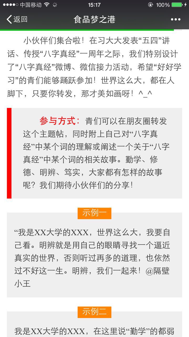 通过微博、微信等媒体平台,形成线上线下两个平台的互动。公司团学微信公众号“食品梦之港”开设“食·天下事”“四进四信”“食力青春”等专栏,以深入浅出的方式为同学们解读“四进四信”的深刻内涵,对社会热点问题进行及时报道。每日提炼团中央、北京团市委和校团委微信公众号中精彩学习内容和成果进行发布,引导青年员工自觉学习专栏内容并转发、评论。借助新媒体打造原文学习、资料查询、心得分享的交流共享平台,实现学习宣传讲话精神的日常化、长期化。