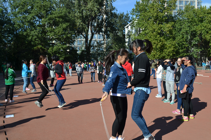 仰卧起坐比赛率先开始,参赛选手们一鼓作气,努力拼搏,最终食品13级的艾运玮同学以67个的好成绩获得了仰卧起坐项目的冠军。继而,“一带一单摇”跳绳比赛紧张而激烈的进行,参赛同学默契配合,精彩的表现赢得了观赛同学的阵阵掌声。经过激烈的较量,应用化学14级的李春瑞同学和许涵琳同学以130个的成绩获得单人赛跳绳项目第一名。