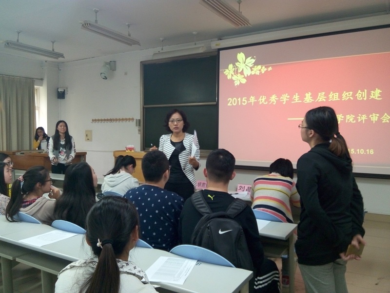 公司大二至大四,三个年级,共有20个班级,15个宿舍参与此次评选,主持人宣布评审会开始,首先进行的是优秀班集体视频展示,依次播放了参评班级准备好的展现班级风貌,党团建设及班级成绩的视频资料,大多数班级视频制作精致,表现方式独特,以不同的视角向大家展示着班级风采。视频展播结束后,党总支副书记胡燕霞老师对各班同学的努力付出表示肯定,并点评了部分优秀视频,最后鼓励大家珍惜在大学的美好时光,勤奋进取,为自己的未来争取更多的选择权。同时各班班长及团支书为参评班级的视频进行打分。优秀班级评审结束后,由15个宿舍的宿舍长对其宿舍进行了简短的自我推荐演讲,针对宿舍成员英语四、六级通过率,平均绩点,党员人数做出汇报。胡燕霞老师对各优秀宿舍提出表扬,并希望大家能够在平时的学习生活中带动周围更多的同学,朝着更积极向上的方向迈进。