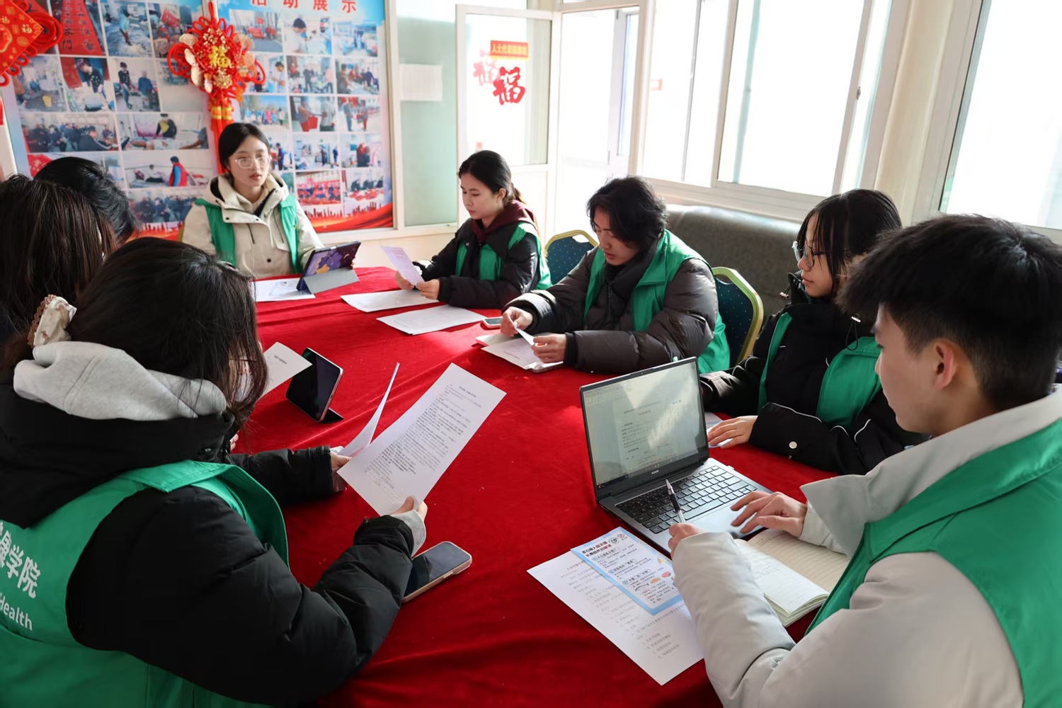 为提升服务精准度,队员提前开展线上调研预热,广泛收集村民健康诉求;依托“大豆博士农场”本土食材研究基础,分析平谷本地大豆等食材的营养成分,有针对性的设计适配老年群体的高蛋白食谱。实践团抵达贤王庄村后,第一时间与村委召开协调会,明确活动流程、场地布局及分工协作细节。村委同步完成活动场地整理、老年群体动员等,实践队员有序清点物资、布置场地、搭建科普宣传易拉宝,准备软皮尺、电子握力计等检测工具,校村协同为专项服务做好保障。